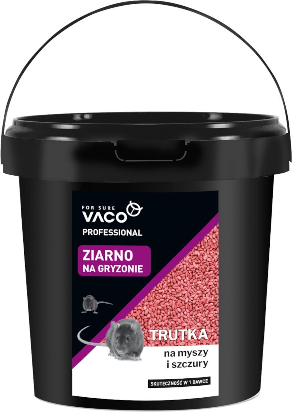 ✅Trutka na myszy i szczury wiadro 3kg ziarno VACO PRO ✅ ✅Preparat w formie ziarna, przeznaczony do zwalczania gryzoni takich jak myszy i szczury. Oparty na substancji czynnej – Bromadiolon. ✅ VACO PROFESSIONAL ZIARNO NA MYSZY I SZCZURY 3 kg PROFESJONALNE ROZWIĄZANIE W DZIEDZINIE DERATYZACJIPoszukujesz skutecznego środka do walki z gryzoniami? Przynęta gryzoniobójcza w formie ziarna przeznaczona do zwalczania myszy i szczurów to niezawodne rozwiązanie dla Twojego problemu. Niezależnie od tego, czy prowadzisz domowy ogród czy stoisz w obliczu wyzwań na polu uprawnym, ta trutka zapewnia ochronę przed szkodnikami, gwarantując bezpieczeństwo Twoim uprawom. Trutka jest gotowa do natychmiastowego użycia. Przeznaczona dla użytku profesjonalnego. SKUTECZNA TRUTKA W FORMIE ZIARNA – KOLOR CZERWONY 50 PPM do zwalczania myszy, szczurów i innych gryzoni, zawiera Bromadiolonu o stężeniu 50 ppm, pożądane opóźnione działanie - nie wywołuje podejrzliwości u gryzoni, zawiera bardzo gorzką substancję zapobiegającą przed spożyciem przez dzieci i zwierzęta, składniki wabiące i atrakcyjna dla gryzoni forma trutki, do użytku profesjonalnego, duża pojemność = wysoka wydajność. Gramatura 3 kg została stworzona z myślą o rolnikach, przedsiębiorcach oraz osobach, które mają priorytetowe zadanie zapewnienia bezpieczeństwa i higieny przed gryzoniami w swoim otoczeniu. CO ZAWIERA TRUTKA NA GRYZONIE? Na skuteczność trutki składają się: Bromadiolon to rodzaj substancji chemicznej, który wpływa na zdolność krzepnięcia krwi u myszy i szczurów, i uszkadza ściany naczyń krwionośnych u gryzoni.Gryzonie, które spożyły trutkę z Bromadiolonem, mogą wydawać się zdrowe przez kilka dni po spożyciu trucizny. Jednak zazwyczaj po ok. 7 dniach zaczynają się pojawiać u nich poważne problemy zdrowotne. Ich krew nie jest w stanie się prawidłowo zatrzymać, co powoduje krwotok wewnętrzny i ostatecznie sprawia, że gryzonie padają. Bitrex (inaczej Benzoesan Denatonium) to związek o niezwykle gorzkim smaku, który zapisał się w Księdze Rekordów Guinnessa jako „najbardziej gorzka substancja znana człowiekowi”. Jest używany jako substancja powstrzymująca ludzi oraz zwierzęta przed spożyciem trutki. Z kolei myszy i szczury nie czują gorzkiego smaku pożywienia, dlatego chętnie zjadają trutkę.Składnik mumifikujący hamuje rozkład martwych gryzoni i zapobiega powstawaniu nieprzyjemnego zapachu. Pomaga w zachowaniu ciał gryzoni w trutkach w suchym i nienaruszonym stanie przez pewien czas. Opóźnia rozkład zwłok i pomaga w zachowaniu higieny miejsca, w którym bytowały gryzonie.Dlaczego trutka na myszy i szczury działa z opóźnieniem?Głównym celem opóźnienia efektu trutki jest oszukanie gryzoni i sprawienie, że nie podejrzewają, iż trutka może być niebezpieczna. Szczury są często bardzo ostrożne wobec nowych substancji i pokarmów, które pojawiają się w ich środowisku. Zanim sięgną po pożywienie, wysyłają jednego szczura "zwiadowcę", którego następnie obserwują przez kilka dni. W momencie, kiedy uznają, że pożywienie jest dla nich bezpieczne, wybierają się na posiłek całymi stadami.W przypadku, gdyby trutka działała natychmiast, gryzonie mogłyby się jej wystrzegać i unikać jej spożycia. Ponadto, opóźnienie działania pozwala gryzoniom spożyć trutkę kilka razy, zanim zaczną odczuwać jej skutki.Wybierając trutkę na myszy i szczury w ziarnie VACO PROFESSIONAL, zyskujesz:Wysoką efektywność: Dzięki stężeniu 50 ppm masz pewność, że produkt działa z dużą skutecznością, szybko rozwiązując problem gryzoni. Dawka 50 ppm przeznaczona jest do użytku profesjonalnego, dlatego działa tak skutecznie, zapewniając bezpieczeństwo tam, gdzie tego potrzebujesz.Bezpieczne zwalczanie: Obecność gorzkiego składnika czynnego minimalizuje ryzyko przypadkowego spożycia przez ludzi i inne zwierzęta, gwarantując jednocześnie skuteczną eliminację gryzoni.Kompleksowe działanie: Produkt kieruje się nie tylko do pojedynczych szkodników, ale także do całościowych problemów związanych z gniazdami myszy i szczurów, zapewniając pełne działanie.Szeroki zasięg działania: Przynęta doskonale działa zarówno przeciw myszom, jak i szczurom, co sprawia, że stanowi wszechstronne rozwiązanie dla różnych rodzajów infestacji.Dużą wydajność: Odpowiednia ilość trutki jest kluczowa dla zapobieżenia potencjalnym stratom oraz zachowania jakości zbiorów. Inwestycja w większe opakowanie jest skutecznym sposobem na utrzymanie higieny w swoich zakładach czy uprawach.Zaawansowana formuła trutki dostarcza Ci skuteczności, na jaką zasługujesz. Poprzez wykorzystanie specjalnych składników wabiących, gwarantujemy atrakcyjność dla gryzoni, co przekłada się na efektywną eliminację. Wybierając VACO PROFESSIONAL, stawiasz na pewność i profesjonalizm. Eliminacja szkodników staje się prosta i skuteczna, bez względu na miejsce. Zaufaj produktowi, który dostarcza rezultaty, a Twój spokój i bezpieczeństwo będą na pierwszym miejscu.DAWKOWANIE:Stosowanie wyłącznie w odpornych na manipulację stacjach deratyzacyjnych:Zwalczanie myszy: 40 g przynęty na stację deratyzacyjnąZwalczanie szczurów: 60-100 g przynęty na stację deratyzacyjnąMinimalna odległość pomiędzy stacjami wynosi 5 m. ✅DV00141 ✅ ✅ ✅Trutka na myszy i szczury wiadro 3kg ziarno VACO PRO ✅