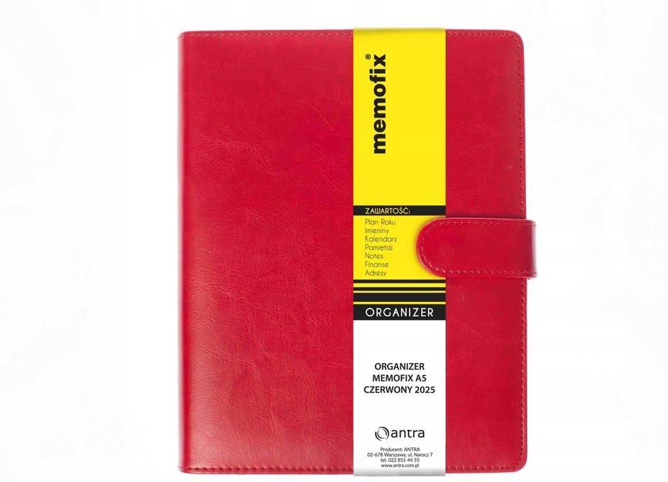Organizer 2025 Memofix A5 Praktyczny czerwony organizer Memofix A5 to doskonałe narzędzie dla osób, które cenią sobie porządek i efektywność. Został wykonany z ekologicznej skóry, oferując elegancki wygląd i trwałość. Funkcjonalność i Praktyczność Organizer ma wymiary 230x175 mm, co czyni go kompaktowym i wygodnym do codziennego użytku. Wewnątrz znajdziesz *wymienne wkłady*, które obejmują kalendarz na 2025 rok, sekcję "pamiętaj", notes, zarządzanie finansami oraz przestrzeń na adresy. Wszystko to pozwala na skuteczne zarządzanie zadaniami i informacjami. Dodatki i Bezpieczeństwo Zamek na zatrzask zapewnia bezpieczeństwo przechowywanych informacji, a dedykowane miejsce na wizytówki oraz długopis pozwala na komfort i szybki dostęp do niezbędnych akcesoriów. Jest to idealny wybór dla osób ceniących sobie organizację i styl w każdym detalu. EAN: 5904210086555