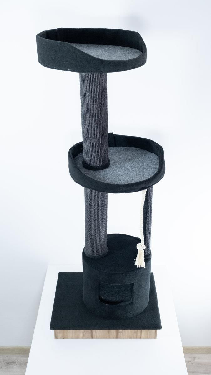 ECOMFY DRAPAK MEGA JACK 152CM SZARY Mega Jack – królestwo Twojego kota Mega Jack to stylowy drapak typu wieża. Należy do linii Family Scratchers Eco. Płyta meblowa, sizal i materiał obiciowy wykorzystane do jego wykonania w 100% pochodzą z recyklingu. Mega Jack posiada dużą powierzchnię do drapania, 2 półki do odpoczynku i obserwacji, budkę-legowisko, która może pełnić funkcję kryjówki, oraz sznurek do zabawy. Do spodu drapaka została przymocowana podstawa z płyty meblowej, co sprawia, że produkt świetnie sprawdzi się jako element wyposażenia wnętrza. Mega Jack dostępny jest w 2 wariantach kolorystycznych: czarno-szarym lub czarno-beżowym. Został wyprodukowany w Polsce. Duży drapak o wielu funkcjach Drapak Mega Jack pomoże zaspokoić kocią potrzebę drapania, zabawy, relaksu i schronienia. Ma 152 cm wysokości, więc będzie świetnym punktem obserwacyjnym dla Twojego kota. Cechy produktu Posiada dużą powierzchnię drapania – słupek o średnicy 12 cm daje większe pole do drapania niż inne tego typu produkty, dzięki czemu kot może swobodnie realizować swoje potrzeby. Jest solidny – produkt wyprodukowano z trwałych materiałów, które zapewniają mu długą żywotność i odporność na uszkodzenia mechaniczne. Jest wysoki – koty uwielbiają obserwować świat z dystansu, a dzięki zaletom drapaka Tower będą mogły bez problemu zaspokoić tę potrzebę. Posiada 2 półki i budkę – bogate wyposażenie drapaka zapewni Twojemu kotu lub kotom maksymalny komfort użytkowania. Zajmuje niewiele miejsca – Mega Jack jest rozbudowany wzwyż, ale jego podstawa ma stosunkowo małą powierzchnię, dlatego drapak bez problemu wpasuje się też w mniejszą przestrzeń. Stanowi wygodny element wyposażenia – posiada podstawę z płyty meblowej zaopatrzoną w ślizgacze, co ułatwia sprzątanie i zmiany aranżacji wnętrza. Ma stylową kolorystykę i elegancki design – dzięki uniwersalnym kolorom drapak pasuje do każdego wnętrza. Jest przyjazny dla środowiska – Mega Jack jest wykonany z materiałów pochodzących w 90% z recyklingu i nadaje się do dalszego przetwarzania. To idealna opcja dla właścicieli kotów, którzy chcą zminimalizować swój negatywny wpływ na środowisko w każdej dziedzinie życia. Rodzaje drapaków w linii Scratchers Family Eco Alex – duża powierzchnia drapania, miejsce do odpoczynku, piłka na sznurku do zabawy Alex z półką – duża powierzchnia drapania, półka-legowisko do odpoczynku, piłka na sznurku do zabawy Paul – duża powierzchnia drapania, półka-legowisko i budka do odpoczynku Tower – duża powierzchnia drapania, półka-legowisko do odpoczynku, sznurek do zabawy Mega Jack – duża powierzchnia drapania, dwie półki-legowiska i budka do odpoczynku, sznurek do zabawy Mata drapak do mocowania – duża powierzchnia drapania, możliwość mocowania w różnych miejscach Mata drapak – duża powierzchnia drapania, możliwość zawieszenie lub ulokowania w dowolnym miejscu. Artykuły Ecomfy tworzymy osobiście – od projektowania do procesu produkcji w fabrykach własnych położonych w Suwałkach i Warszawie. Nasze produkty bazują na naturalnych materiałach, mieszankach pochodzących z recyklingu i surowcach odzyskanych z produkcji. 3P System wartości Ecomfy jest definiowany przez 3P – ludzi (People), zwierzęta (Pets) i planetę (Planet).