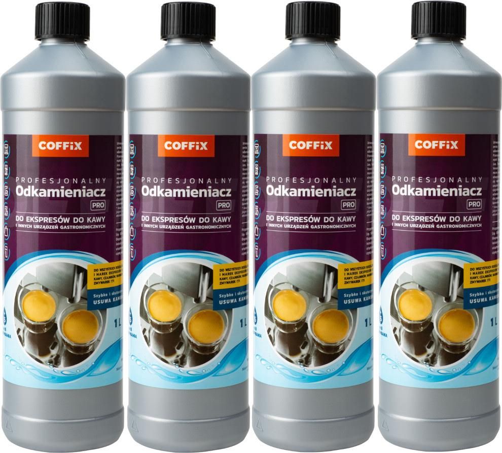 Profesjonalny Płyn do Odkamieniania Ekspresów do Kawy, Czajników i innych Urzadzeń Gastronomicznych COFFIX PRO Zestaw 4x1L Uniwersalny odkamieniacz na bazie kwasów amido i metanosulfonowego do odkamieniania ekspresów do kawy Szybko i skutecznie usuwa kamień! Przeznaczony do odwapniania urządzeń …