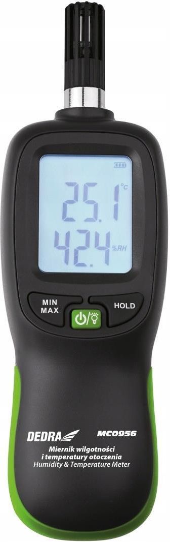 Miernik wilgotności i temperatury otoczenia DEDRA MC0956 Opis produktu Miernik wilgotności i temperatury otoczenia DEDRA MC0956 to narzędzie znajdujące zastosowanie m.in. w branży budowlanej, rolnictwie, przemyśle spożywczym, farmaceutycznym, a także w codziennym użytkowaniu. W branży budowlano-remontowej wykorzystać go można do pomiaru wilgotności i temperatury w pomieszczeniach, co pomaga w identyfikacji potencjalnych problemów związanym z wilgocią, takich jak pleśń czy zagrzybienia. W rolnictwie, umożliwia monitorowanie warunków wzrostu roślin, a w przemyśle spożywczym i farmaceutycznym pozwala na kontrolę wilgotności, która kluczowa jest dla utrzymania odpowiedniej jakości produktów oraz przestrzegania norm sanitarnych. W codziennym użytkowaniu przyda się w domach, biurach czy magazynach, gdzie kontrola warunków otoczenia jest istotna dla komfortu pracy i życia. Dodatkowo miernik wyposażony został w cztery funkcje pomiaru temperatury, co czyni go profesjonalnym narzędziem pomiarowym. Wskaźnik niskiego poziomu baterii poinformuje nas o zbliżającym się rozładowaniu ogniw zasilających, a system automatycznego wyłączania zapewnia oszczędność baterii. Miernik zasilany jest trzema bateriami AAA, a jego kompaktowe wymiary oraz niska waga sprawiają, że jest to praktyczne i podręczne urządzenie. Urządzenie przystosowane zostało do współpracy ze statywem o standardowym wymiarze ¼”. Cechy produktu Wskaźnik niskiego poziomu baterii - kontrola czasu pracy urządzenia Data Hold - zatrzymanie aktualnego pomiaru Cztery funkcje pomiaru temperatury Wysoka pamięć pomiarów - do 1000 zapisów Wyłączanie automatyczne [10 min] - oszczędność baterii Szybka reakcja odczytu temperatury [30 sekund] Dane techniczne Zastosowanie: do rejestrowania poziomu wilgotności względnej i temperatury otoczenia Funkcje pomiaru: temperatury (zwykła, czyli termometru suchego) temperatury termometru mokrego (ang WB = wet-bulb) temperatury punktu rosy (ang. DP = dew-point) wilgotności względnej powietrza Rodzaj wyświetlacza: podświetlony na biało LCD Rozmiar gwintu statywu: 1/4" (6.35 mm) Dokładność pomiaru temperatury: ±1°C Dokładność pomiaru wilgotności względnej Rh: ±4 % Jednostki pomiarowe: °C, °F Zakres pomiaru temperatury: -20 ~ +70°C Temperatura punktu rosy: -20~ +50°C Temperatura mokrego termometru: -20~ +50°C Dokładność pomiaru temp.punktu rosy i mokrego termometru: ±2°C Zasilanie: 3x1.5V; AAA Wymiary: 56x184x36 mm Masa: 106 g (bez baterii) Kupując otrzymujesz 1 x Miernik wilgotności i temperatury otoczenia 3 x Bateria AAA