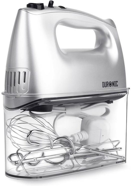 MIKSER RĘCZNY Duronic 5 PRĘDKOŚCI FUNKCJA TURBO 400W Mikser Duronic HM4 to niezastąpione urządzenie dla wszystkich miłośników pieczenia i gotowania. Lekki i bardzo ergonomiczny w wykonaniu, a jednocześnie o dużej mocy (400 W). Elegancka i ergonomiczna obudowa sprawia, że mikser pewnie leży w ręku. Pojemnik dołączony do zestawu umożliwia wygodne przechowywanie akcesoriów, bez tracenia czasu na ich poszukiwanie przed każdym użyciem. W zestawie znajduje się najpotrzebniejszy komplet wierteł: trzepaki do ubijania śmietany czy ucierania żółtek, mieszaki do wyrabiania ciasta i trzepaczka do ubijania piany. Wszystkie wykonane ze stali nierdzewnej. Dzięki jednemu przyciskowi możesz zwolnić końcówki i łatwo wymienić akcesoria w trakcie przygotowywania wypieków. Front obudowy wyposażony jest w otwory wentylacyjne, co zmniejsza ryzyko przegrzania urządzenia. Mieszaki poradzą sobie nawet z nawet ciężkim rodzajem ciasta, dlatego pieczenie np. chleba stanie się jeszcze łatwiejsze. Kremy, ubijanie bitej śmietany czy naleśniki to nie żadne wyzwanie dla tego urządzenia. Dołączona do zestawu misa zapewnia utrzymanie wszystkich elementów w jednym miejscu. Możesz w niej przechowywać nie tylko zestaw wierteł dołączony do miksera, ale także inne akcesoria jakich używasz najczęściej do pieczenia i gotowania. W ten sposób zaoszczędzisz miejsce w swojej kuchni i swój czas. Nie spędzisz ani chwili na poszukiwaniach przyborów do pieczenia. Aby mieć pewność, że wszystkie potrawy są optymalnie przygotowane masz do wyboru aż 5 poziomów prędkości. Jeżeli jednak maksymalna prędkość to wciąż za mało, zawsze możesz użyć funkcji Turbo i przygotować swoje wypieki jeszcze szybciej. Ten model dostępny jest w trzech kolorach: czarnym, białym oraz srebrnym, tak abyś mógł bez problemu dopasować wersje urządzenia do stylu Twojej kuchni. Duronic HM4 mikser ręczny HM4 to lekki i poręczny mikser do szybkiego użytkowania z wygodnym rozwiązaniem ułatwiającym przechowywanie. Ponieważ jest zawsze pod ręką nie będziesz ręcznie mieszał ciasta na naleśniki lub masy na kotlety mielone. Dodatek w postaci pojemnika do przechowywania sprawia, że wszystko co potrzebujesz masz w zasięgu ręki. Bez przeszukiwania szafek i szuflad po odpowiedni rodzaj mieszadła i to najczęściej w dwóch egzemplarzach w dwóch końcach szuflady lub szuflad. HM4 to lekki i poręczny mikser do szybkiego użytkowania z wygodnym rozwiązaniem ułatwiającym przechowywanie. Ponieważ jest zawsze pod ręką nie będziesz ręcznie mieszał ciasta na naleśniki lub masy na kotlety mielone. Dodatek w postaci pojemnika do przechowywania sprawia, że wszystko co potrzebujesz masz w zasięgu ręki. Bez przeszukiwania szafek i szuflad po odpowiedni rodzaj mieszadła i to najczęściej w dwóch egzemplarzach w dwóch końcach szuflady. Mikser HM4 został zaprojektowany w duchu maksymalnej praktyczności dlatego jest niezwykle lekki i łatwy do obsługi jedną ręką. Wygodny, ergonomiczny uchwyt, panel z regulacją prędkości i funkcja turbo w zasięgu palca. Drugą rękę masz wolną, aby ewentualnie przytrzymać misę lub dodawać kolejne składniki. Po zakończeniu pracy zdemontujesz trzepaki za pomocą przycisku zwalniającego znajdującego się w górnej części obudowy. Do urządzenia dołączonych jest 5 akcesoriów: 1trzepaczka, 2 mieszaki do ciasta, 2 trzepaki. Wszystkie te elementy wykonane są ze stali nierdzewnej. W porównaniu z mikserami wolnostojącymi HM4 oszczędza wiele miejsca ze względu na swoje kompaktowe wymiary. Z łatwością schowasz go w szafce kuchennej, pomiędzy innymi urządzeniami lub w spiżarni. 5 prędkości 400W mocy Miser wyposażony jest w silnik o mocy 400W , aby szybko i skutecznie wymieszać lub ubić wszystkie składniki. Za pomocą górnego pokrętła wygodnie zmienisz prędkość obrotów - masz do wyboru aż 5 pozycji oraz funkcję Turbo, gdy potrzebujesz prawdziwego przyspieszenia i dodatkowego napowietrzenia mikstury. Lekka konstrukcja HM4 to bardzo lekki model, dzięki czemu nie zmęczysz za nadto reki, gdy przyjdzie sezon świątecznych wypieków lub po prostu większa impreza. Panel z regulacją prędkości znajduje się w górnej części obudowy, więc obsłużysz mikser tylko jedną ręką. Łatwa organizacja Zmiana wierteł jest bardzo prosta - wystarczy wcisnąć przycisk zwalniający. Wszystkie mieszaki i trzepaki wykonane są ze stali nierdzewnej i umyjesz je w ciepłej wodzie z płynem w zaledwie kilka sekund. Po zakończeniu pracy wszystkie akcesoria przełóż do pojemnika - wtedy wszystko jest w jednym miejscu.
