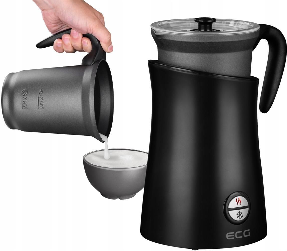 Magnetyczny spieniacz do mleka o mocy 550 W o pojemności 300 ml na podgrzewanie i 150 ml na spienianie. ECG NM 2255 Latte Art Black został wyposażony w podwójne ścianki z powłoką nieprzywierającą i złącze STRIX z funkcją automatycznego wyłączania. Oferuje możliwość przygotowania gorącej czekolady, frappe i innych napojów mlecznych.