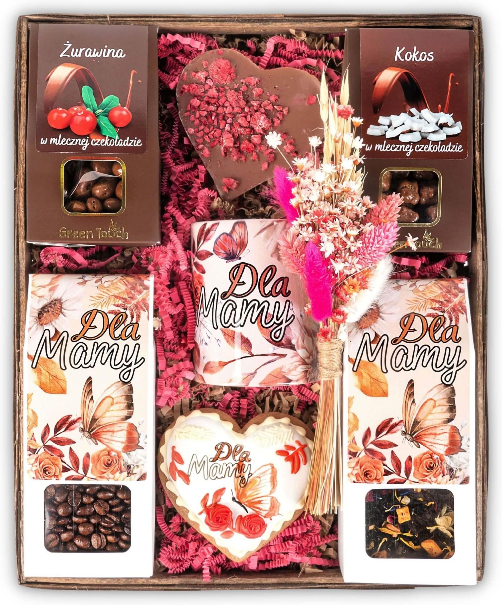 Duży kosz prezentowy na dzień matki kubek kwiaty Wyjątkowy kosz Dla Mamy: kawa, herbata, kubek, słodycze i więcej - idealny prezent na Dzień Matki! Duży kosz prezentowy na dzień matki kubek kwiaty Ten piękny kosz prezentowy dla mamy zawiera karmelową kawę, owocową herbatę, uroczy kubek z motywem "Dla Mamy", serce z piernika, czekoladę, suszone kwiaty oraz przekąski. Całość zgrabnie zapakowana w drewnianym koszyku, gotowa do wręczenia! Kosz prezentowy zawiera Kawa ziarnista lub mielona 120 g o smaku karmelowym 100% arabica w okazjonalnym pudełku z motywem “Dla Mamy” Herbata liściasta premium 60 g. Herbata czarna smakowa z dodatkami różnych owoców w okazjonalnym białym pudełku “Dla Mamy”. Składniki: herbata czarna Ceylon OP, papaja kandyzowana (papaja, cukier), jabłko suszone, ślaz, róża płatki, nagietek, bławatek, aromat. Kubek 330 ml z nadrukiem. Ten uroczy kubek został ozdobiony pięknym nadrukiem w motywie “Dla Mamy”. Piernik w kształcie serca z motywem “Dla Mamy” 50 g. Wymiary: 10,5 x 9,5 cm. Składniki: mąka pszenna typ450, cukier, jaja, kakao, margaryna, miód, przyprawa do piernika, soda oczyszczona, barwnik spożywczy. Czekolada w kształcie serca 40 g z manufaktury czekolady z dodatkiem różnych owoców liofilizowanych - naturalna z dodatkiem wanilii bourbon. Wiązka suszonych naturalnych kwiatów, kolorystycznie dobrana do pozostałych składowych prezentu. Suszone kwiaty stanowić mogą piękną i naturalną ozdobę w naszym domu na długi czas. Żurawina w mlecznej czekoladzie 100 g. Kokos kostki w mlecznej czekoladzie 100 g. Drewniany koszyk z naturalnej plecionki sosnowej, malowany z wypełnieniem w postaci wełny drzewnej. Całość jest zafoliowana i stanowi gotowy do wręczenia prezent UWAGA: na życzenie możemy: zmielić kawę przed wysyłką (prosimy o informację w wiadomości dla sprzedającego). Jak wyglądają oryginalne kosze prezentowe Green Touch ? Nasze kosze prezentowe ręcznie plecione, produkowane w Polsce całość zafoliowana i gotowa do wręczenia podwójna lub pojedyncza ozdobna banderola o szerokości 5cm dopełniająca i zwieńczająca cały prezent zwarte, twarde i odporne na uszkodzenia malowane na piękny brązowy kolor ozdobne wypełnienie w postaci papieru kraftowego Wymiar prezentu z oferty 35 cm (długość) 25 cm (szerokość) 8 cm (wysokość) Opcja dodatkowa "Zapakuj na prezent" (kartka prezentowa) Szanowni Państwo jako opcję dodatkową można dokupić do każdego koszyka piękną składaną kartkę na której możemy wydrukować Państwa życzenia. Opcję dodatkową realizujemy już w koszyku i jest ona dodatkowo płatna. złożona kartka o wymiarach 13,5 x 13,5 cm elegancki nadruk oraz gruby fakturowany papier na froncie kartki napis "Wyjątkowy Prezent" kartka dodatkowo wkładana jest do kraftowej koperty dowolny tekst wewnątrz do 400 znaków tak przygotowany kosz możemy również wysłać bezpośrednio do obdarowanej osoby