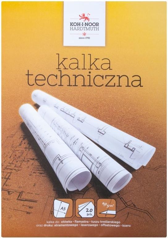 Kalka techniczna A3 przezroczysta 20 arkuszy 90g Koh-i-noor Kalka kreślarska charakteryzująca się doskonałą przezroczystością, ekstra gładkim wykończeniem oraz odpornością na drapanie i wielokrotne wymazywanie. Nie żółknie, a neutralne pH zapewnia optymalną jakość. Idealna do kreślenia ołówkiem, tuszem i pisakami. Kalka kreślarska do kreślenia ołówkiem, tuszem i mazakiem Doskonale przezroczysta i gładka, odporna na promieniowanie UV (nie żółknie z czasem) i nie blaknie Wysoka jakość surowców gwarantuje trwałość kalki i nadruków Przeznaczenie głównie do rysunku technicznego: dla architektów i projektantów, drukarzy, studentów oraz do celów ozdobnych (np. wkładki do zaproszeń, karnetów) Możliwe jest stosowanie jej do drukarek laserowych i kserokopiarek, ploterów i drukarek atramentowych, rapidografu, ołówka i mazaka, druku Format: A3 Ilość arkuszy: 20 Gramatura: 90 g/m2