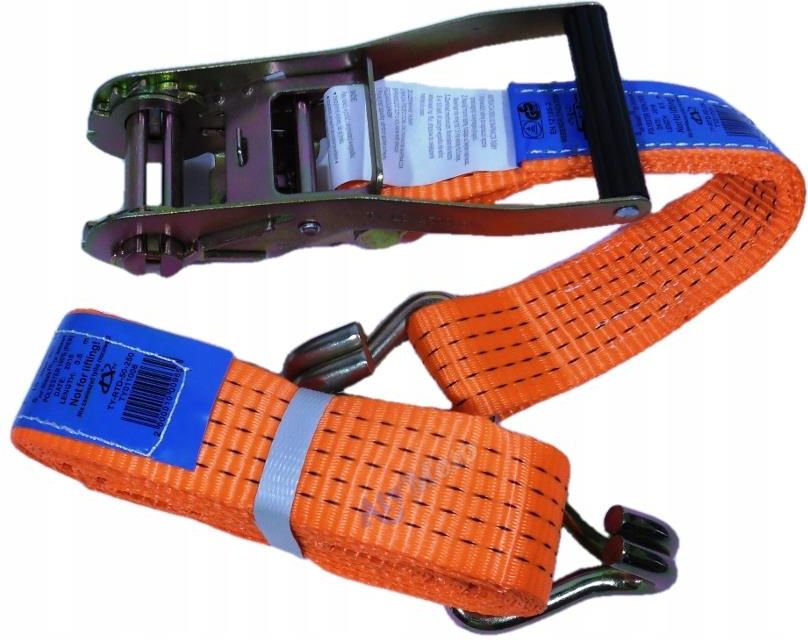 Profesjonalny pas mocujący AKC5004 jest niezawodnym narzędziem do zabezpieczania ładunków, zaprojektowanym zgodnie z normami europejskimi, co gwarantuje najwyższą jakość i bezpieczeństwo użytkowania. Idealny dla profesjonalistów wymagających solidnych i trwałych rozwiązań mocujących. Specyfikacja Produktu Materiał: 100% polyester Kolor: Pomarańczowy Szerokość: 50 mm Długość Kompletna: 4 m Zdolność Mocowania (LC): 2500 daN Wydłużenie Taśmy: 7% Siła Trzymająca Stała (STF): 300 daN Siła Trzymająca Ręczna (SHF): 50 daN Certyfikaty: PN-EN 12195-2:2000, AfPS GS 2004:01 PAK Właściwości Produktu Bezoprawkowa Konstrukcja: Zakończony hakami „podwójny pazur” Elastyczność: Elastyczny mostek dla komfortowego dopasowania Przyczepność: Gumowe końcówki zauszników Bezpieczeństwo: Nieprzewodząca oprawka z materiału izolacyjnego Ochrona: Uniwersalne zastosowanie w różnych branżach Instrukcja Użytkowania Nie używać pasów jako zawiesia. Nie przekraczać obciążenia LC. Używać co najmniej dwóch pasów do mocowania opasaniem i czterech jako odciągi. Pasy muszą być nieuszkodzone i bez widocznych wad. Napinanie: wprowadzić taśmę od spodu, ręcznie przyciągnąć, mocno napinać ruszając uchwytem tam i z powrotem, nawinąć 1,5 do 3 zwojów. Zabezpieczyć napinacz przed podróżą. Zalecenia Dotyczące Bezpieczeństwa Regularnie sprawdzać pasy na obecność uszkodzeń. Wycofać z użycia pasy z widocznymi uszkodzeniami, przecięciami, odkształceniami, korozją lub brakującą/nieczytelną etykietą. Oczyszczać pasy przepłukując tylko wodą. Temperatury pracy dla PES: od -40 °C do 120 °C.