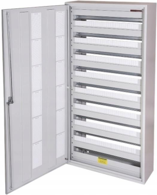 Rozdzielnica UNI SYSTEM 750-1450-250 M 9x36 (324 moduły) KARWASZ UNI SYSTEM 750-1450-250 MDane techniczne:Uni 500 VInc 63 AIP-30Lakierowana kolor szary RAL 7035Blacha stalowa 1,2 - 1,5 mmWyposażenie:9 euroszyny TH-35miejsce na 9x36= 324 zabezpieczeń typu Sdrzwiczki pełne zamykane na zamek …