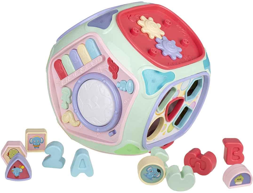 INTERAKTYWNA KOSTKA DLA DZIECI Rewelacyjna zabawka interaktywna zaprojektowana z myślą o najmłodszych pociechach. Pastelowe kolory przyciągną uwagę Twojego dziecka i zachęcą do zabawy. Wykonana z dbałością o każdy szczegół. Kostka składa się z siedmiu ścian. Każda ze ścian została wyposażona w inne atrakcje: Ścianka z sorterem w kształcie cyferek. Ścianka z sorterem w kształcie figur geometrycznych. Interaktywna ścianka z grającym pianinkiem i świecącym bębenkiem. Interaktywna ścianka z wyjmowanym telefonem (po przyciśnięciu guzików wydobywają się dźwięki zbliżone do prawdziwego urządzenia) Ścianka z puzzlami do ułożenia Ścianka z otwieranymi drzwiczkami, kością na sznureczku i kluczykiem w kształcie pieska Ścianka sensoryczna Szereg różnych funkcji uatrakcyjni zabawę i pomoże dziecku w poznawaniu świata. Zabawka ma na celu naukę poprzez zabawę. Dziecko dzięki kostce nauczy się rozpoznawać kształty, kolory i dźwięki. Dodatkowo zabawka pobudza kreatywność, twórcze myślenie i wspomaga rozwój zdolności manualnych. Magiczna zabawka, która zajmie malucha na długie godziny i przyniesie mu mnóstwo atrakcji i radości. Zabawka posiada 2 tryby głośności. Doskonały pomysł na prezent! Zalety: *Bardzo duża 25cm x 25cm *Solidnie wykonana *Pastelowa kolorystyka *Posiada efekty świetlne i dźwiękowe *Nauka przez zabawkę *Posiada wysuwaną rączkę do przenoszenia *Pozytywnie wpływa na rozwój logicznego myślenia i zdolności manualnych dziecka. *Pomocna podczas nauki nazw kolorów, kształtów i dźwięków. *Duża liczba bodźców Dane techniczne: *Tworzywo: plastik *Zasilane: 3x bateria 1,5V AA (brak w zestawie) *Wymiary: 25cm x 25cm x 25cm *Kolor: wielokolorowy Wymiary opakowania: 31cm x29cm x 28,7cm
