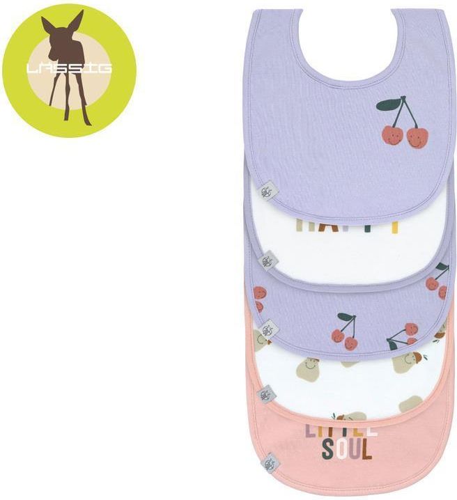 Zestaw pięciu miękkich, bawełnianych śliniaków niemieckiej marki LASSIG. Każdy inny: dwa lawendowe z motywem uśmiechniętych wisienek, różowy z napisem HAPPY LITTLE SOUL, biały z motywem uśmiechniętej gruszki oraz biały z kolorowym napisem HAPPY. Wodoodporne, bezpieczne, przydatne przy karmieniu …