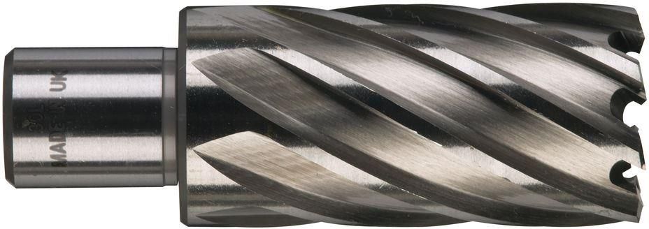 Milwaukee Frezy Obwodowe HSS O 100% większa szybkość i oszczędność została osiągnięta dzięki następującym czynnikom. Po pierwsze sposób cięcia frezem obwodowym polega na cięciu materiału na skraju otworu, natomiast wiertło kręte musi wyciąć pełną średnicę otworu. Po drugie, dzięki dwom ostrym kątom na każdej krawędzi skrawającej jest możliwe osiągnięcie większych szybkości posuwu i mniejszego oporu frezowania. O 30% większa wydajność – dzięki temu, że frez obwodowy tnie materiał tylko na krawędzi otworu. Potrzebna jest mniejsza energia silnika i moc napędowa. Im większa średnica wiertła, tym większa oszczędność energii. Dłuższa żywotność – Frezy obwodowe wykonują mniejszą pracę podczas cięcia krawędzi niż wiertło kręte, dzięki czemu wywiercą więcej otworów od jednego ostrzenia do następnego. Korpus o grubości 6 mm oraz specjalna geometria zęba zapewniają wysoką stabilność i zmniejszają do minimum ryzyko złamania z powodu przeciążenia. Frezy obwodowe HSS o grubych ściankach zapewniają zwiększenie trwałości i żywotności. Posiadają standardowy chwyt 19 mm Weldon. Głębokość skrawania 50 mm.Głębokość skrawania 50 mm.