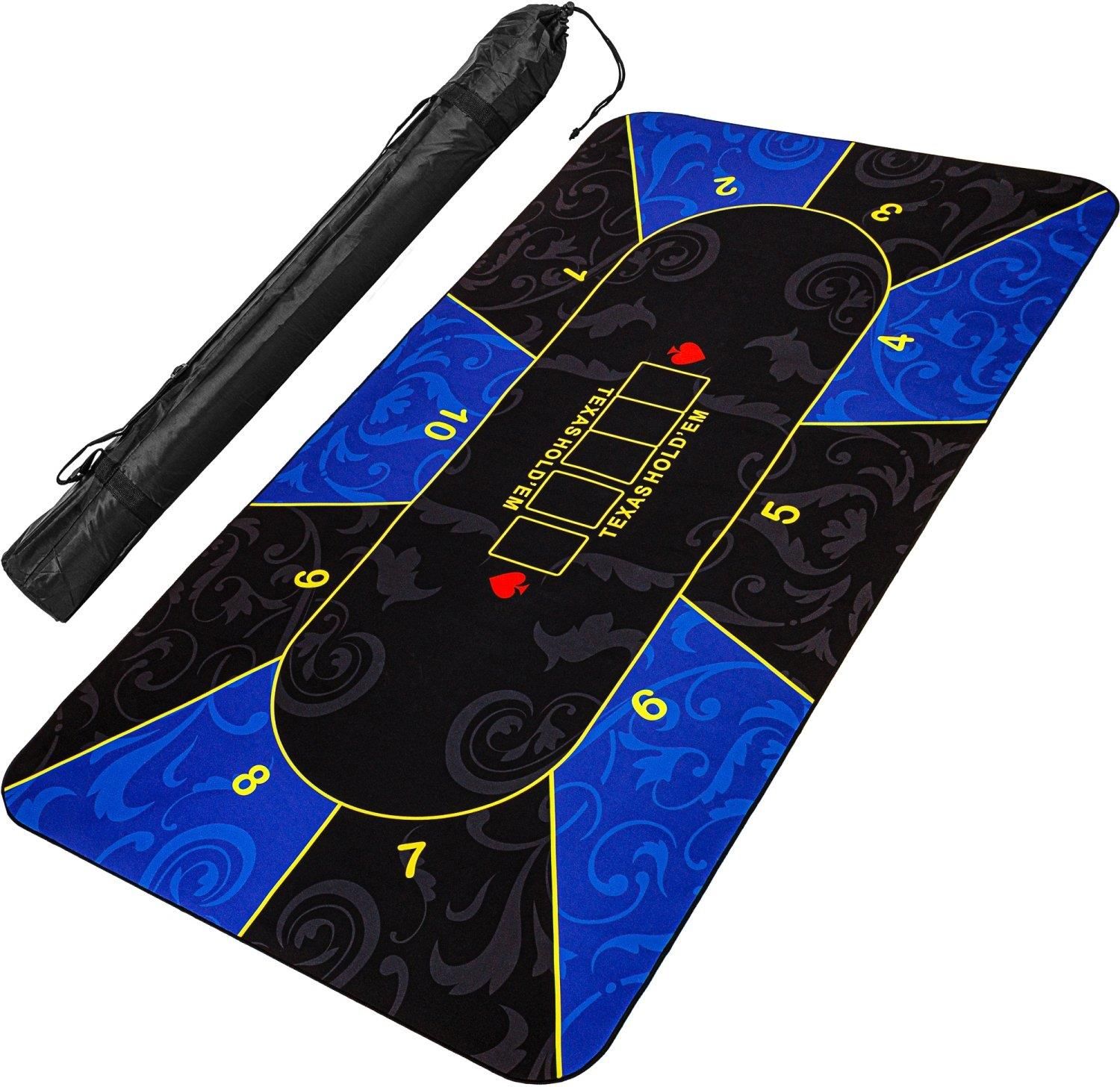 Mata do pokera jest odpowiednia dla maksymalnie 10 graczy. Przód jest wykonany z poliamidu, a materiał jest przyjemnie miękki i gładki w dotyku (podobnie jak podkładka pod mysz). Tył wykonany z antypoślizgowej gumy naturalnej - gumowa powłoka zapobiega ślizganiu się ochraniacza. Podkładkę można zwinąć, aby zaoszczędzić miejsce i można ją łatwo zabrać w dowolne miejsce dzięki dołączonej torbie. Dane techniczne: wymiary: 160 x 80 cm grubość: 3 mm przeznaczony dla maksymalnie 10 graczy kolor: niebiesko-czarny górna strona: 100% hydrofobowy poliamid spodnia strona: 100% kauczuk naturalny o dobrej przyczepności mata do pokera można zwinąć Zawartość opakowania: 1 x mata do pokera 1 x torba transportowa