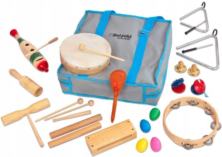 Zestaw duży instrumenty muzyczne W komplecie z praktyczną torbą. Gabaryty otwartej torby 90 cm x 40 cm ! Torbę po złożeniu i zamknięciu na zamek błyskawiczny można przewieszać na ramieniu.W zestawie: 2 szt. tamburyny Nr 1 o średnicy 15 cm; Nr 2 o średnicy 20 cm 5 szt. trójkątów o zróżnicowanej długości podstawy od 10 do 20 cm 2 szt. drewniane marakasy 1 szt. duża tarka giro 2 szt. tonbloki dwutonowe 1 szt. tonblok jednotonowy 1 szt. pudełko akustyczne 1 szt. kastaniety na rączce 2 szt. kastaniety palcowe 1 szt. para klawesów 1 szt. metalowy shaker 4 szt. pałeczki