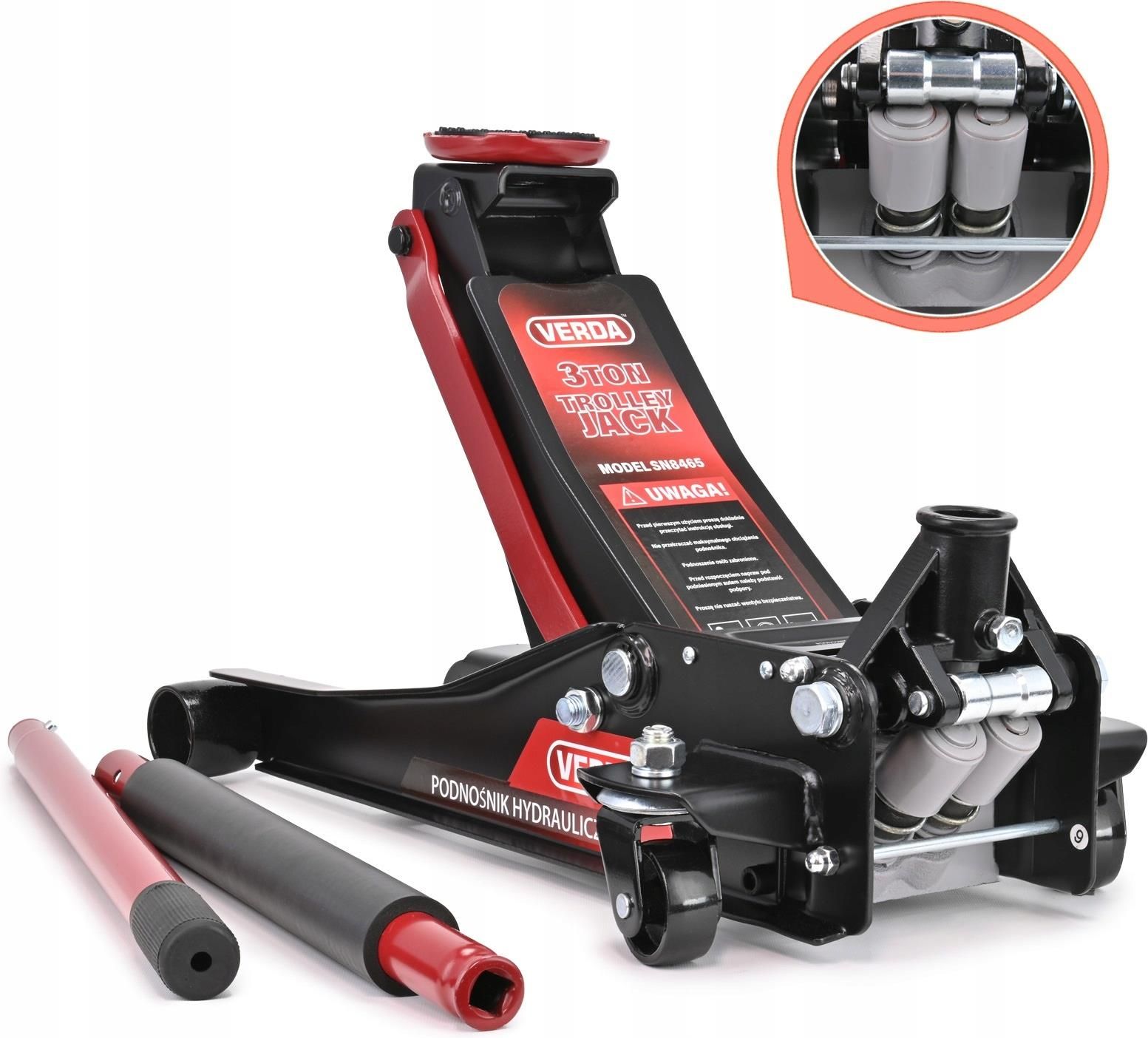 PODNOŚNIK HYDRAULICZNY NISKOPROFILOWY 3T SN8465 MODEL: SN8465 RENOMOWANA I UZNANA MARKA VERDA + PRAKTYCZNA GUMA OCHRONNA! MOCNY I SOLIDNY! DWUTŁOKOWY! MARKA: VERDA MODEL: SN8465 DWA TŁOKI! NISKI PROFIL! UDŹWIG 3T DANE TECHNICZNE: Udźwig: 3000 kg Guma zabezpieczająca gratis, Wysokość minimalna: 83mm, Wysokość maksymalna: 465mm, 4 koła jezdne, w tym 2 skrętne, Wykonany z wysokiej jakości materiałów - wytrzymały i solidny, Kola jezdne umożliwiające przesuwanie podnośnika w dowolne miejsce, ZALETY: SZYBKIE PODNOSZENIE, NIEZAWODNA MARKA VERDA, PRZEZNACZONY DO PRACY W WARSZTACIE JAKO PROFESJONALNY PODNOŚNIK ORAZ W PRZYDOMOWYM GARAŻU, NISKI PROFIL POZWALA NA OBSŁUGĘ SAMOCHODÓW SPORTOWYCH Z OBNIŻONYM ZAWIESZENIEM, STALOWE KOŁA NA PRZEDZIE I TYL, Z TYŁU KOŁA SKRĘTNE, ODPORNY NA USZKODZENIA. 2-TŁOKI gwarantujące szybkie i bezproblemowe podnoszenie. Solidna i niezawodna konstrukcja! Niski profil 83mm nadaje się do samochodów z bardzo niskim zawieszeniem!!! Dwa tłoki - szybkie i bezproblemowe podnoszenie! SZEROKIE, SOLIDNE I MOCNE STALOWE KOŁA Z PRZODU! NIEZAWODNE, ŁOŻYSKOWANE, SKRĘTNE KOŁA TYLNE Praktyczny pojemnik na śrubki i nakrętki.