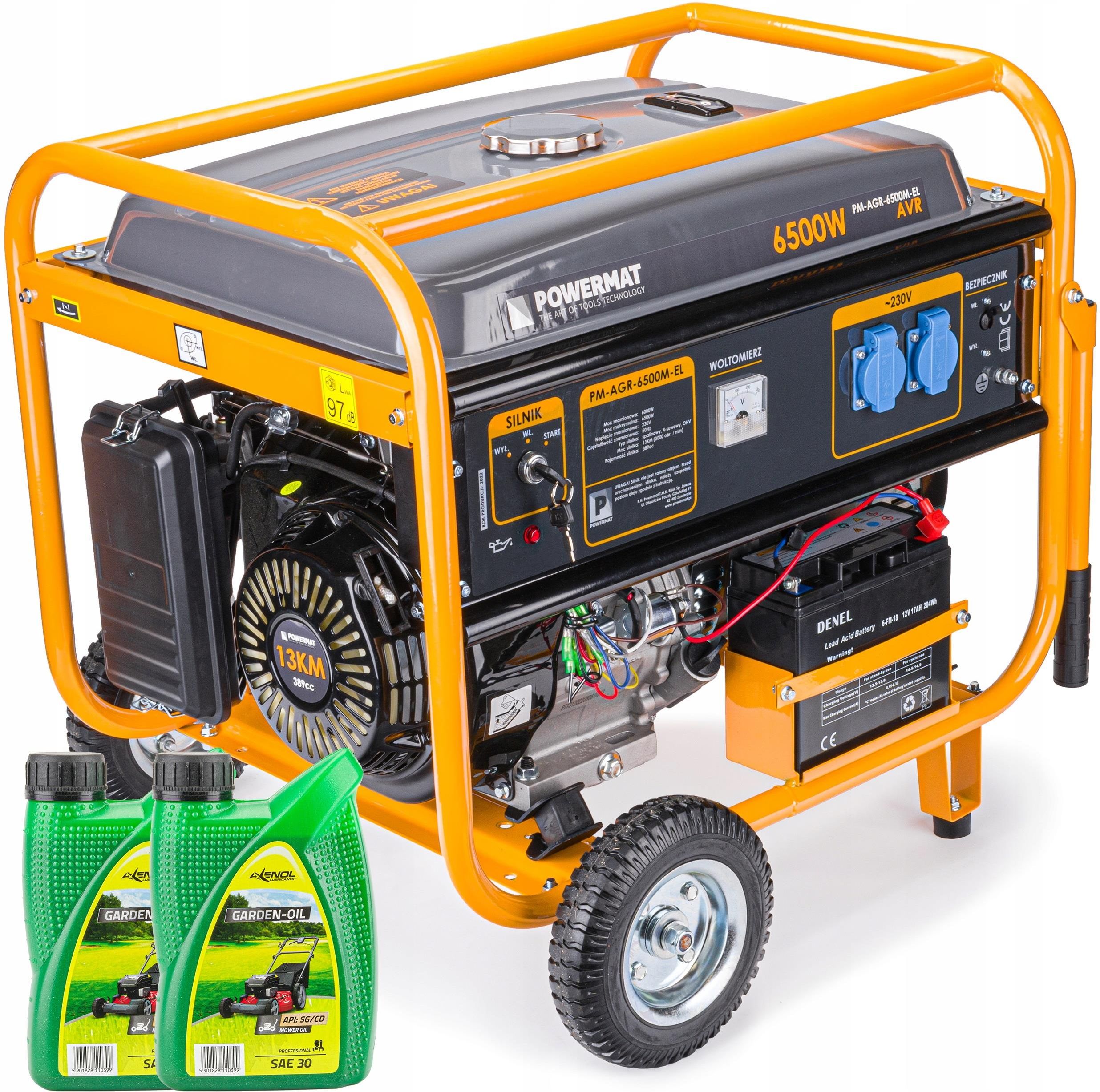 AGREGAT PRĄDOTWÓRCZY 13KM 2x 230V 6500W + 2x OLEJ 0,6L (ELEKTRYCZNY ROZRUCH) Model: POWERMAT PM-AGR-6500M-EL Nowa udoskonalona wersja 2022r Dane techniczne: wytwarzany prąd: 230 V / 50 Hz maks. moc AC: 6,5 kW moc stała AC: 6 kW obroty silnika: 3000 obr./min pojemność silnika: 389 cm³ wbudowany woltomierz wyłącznik bezpieczeństwa pojemność zbiornika oleju: 1,1 l zbiornik na paliwo: 24 l moc silnika: 13 KM silnik czterosuwowy chłodzony powietrzem czujnik ciśnienia oleju akumulator elektryczny rozruch z kluczyka koła i uchwyty transportowe stabilizator napięcia AVR wymiary: 70 x 51 x 64 [cm] waga: 77 kg Poziom mocy akustycznej Lwa: 97 dB Wyposażenie: agregat klucz do świec instrukcja PL oryginalne opakowanie 2x olej silnikowy SAE 30 Agregat wytwarza prąd o napięciu 230V (2 gniazda). Doskonałe rozwiązanie na brak prądu w terenie. Wyposażony w woltomierz oraz bezpieczniki. Agregat posiada czujnik poziomu oleju który automatycznie wyłączy silnik w przypadku zbyt niskiego jego poziomu. Rozruch agregatu ręczny - za pomocą linki. Agregat stosowany w rzemiośle, budownictwie na działkach i ogrodach do prac z elektronarzędziami , pompami, oświetleniem. Gumowe amortyzatory bardzo dobrze redukują, przenoszenie wibracji z silnika na obudowę agregatu. Agregat napędzany jest silnikiem jednocylindrowym czterosuwowym OHV o mocy 13KM. Dzięki dużej mocy silnika, agregat utrzyma obroty nawet przy szczytowym obciążeniu. Zbiornik posiada orientacyjny wskaźnik poziomu benzyny. Sitko zamontowane w zbiorniku paliwa skutecznie wyłapie nieczystości stałe, które mogą znajdować się w paliwie. Nr oferty xSale 12544158085