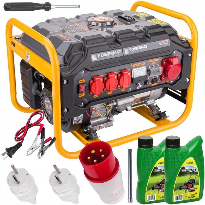 AGREGAT PRĄDOTWÓRCZY 7KM 230V/400V 3000W + 2x OLEJ 0,6L Model: POWERMAT PM-AGR-3000MNS Nowa udoskonalona wersja 2023r z trzema gniazdami na 230V, 1x 400V + 1x 12V DC Dane techniczne: wytwarzany prąd: 230 V / 400 V / 50 Hz AC oraz 12V DC maks. moc AC: 3 kW moc stała AC: 2.8 kW obroty silnika: 3000 obr./min pojemność silnika: 212 cm³ wbudowany woltomierz maksymalny czas pracy ciągłej: 10h (przy obciążeniu 60%) wyłącznik bezpieczeństwa pojemność zbiornika oleju: 0,6 l zbiornik na paliwo: 15 l moc silnika: 7 KM silnik czterosuwowy chłodzony powietrzem czujnik ciśnienia oleju silnik benzynowy stabilizator napięcia AVR wymiary: 59 x 46 x 43 [cm] waga: 36 kg poziom mocy akustycznej Lwa: 96 dB Innowacyjna Technologia DUAL POWER (PODWÓJNA MOC) -podwójne uzwojenie prądnicy. W standardowej prądnicy siłowej na gniazdo 230V przypada tylko 1/3 mocy agregatu, a agregat jednofazowy wytwarza napięcie tylko 230V. Zastosowana Technologia DUAL POWER pozwala na korzystanie z pełnej mocy agregatu zarówno przy napięciu 400V(siła) jak i 230V. Umożliwia ona podłączenie urządzeń dużej mocy siłowych i jednofazowych. Dzięki niej agregat staje się w pełni uniwersalny i spełnia funkcję agregatu jednofazowego i trójfazowego jednocześnie. Zatem nie ma potrzeby kupowania dwóch agregatów. Wyposażenie: agregat klucz do świec śrubokręt 2x wtyka 230V (16A) 1x wtyka 400V (16A) instrukcja PL oryginalne opakowanie 2x olej silnikowy SAE 30 Agregat wytwarza prąd przemienny o napięciu 230V (3 gniazda), 400V (1 gniazdo) oraz prąd stały 12V (1 gniazdo). Doskonałe rozwiązanie na brak prądu w terenie. Wyposażony w woltomierz oraz bezpieczniki. Agregat posiada czujnik poziomu oleju który automatycznie wyłączy silnik w przypadku zbyt niskiego jego poziomu. Rozruch agregatu ręczny - za pomocą linki. Agregat stosowany w rzemiośle, budownictwie na działkach i ogrodach do prac z elektronarzędziami, pompami, oświetleniem. Gumowe amortyzatory bardzo dobrze redukują, przenoszenie wibracji z silnika na obudowę agregatu. Agregat napędzany jest silnikiem jednocylindrowym czterosuwowym OHV o mocy 7KM. Dzięki dużej mocy silnika, agregat utrzyma obroty nawet przy szczytowym obciążeniu. Zbiornik posiada orientacyjny wskaźnik poziomu benzyny. Sitko zamontowane w zbiorniku paliwa skutecznie wyłapie nieczystości stałe, które mogą znajdować się w paliwie.
