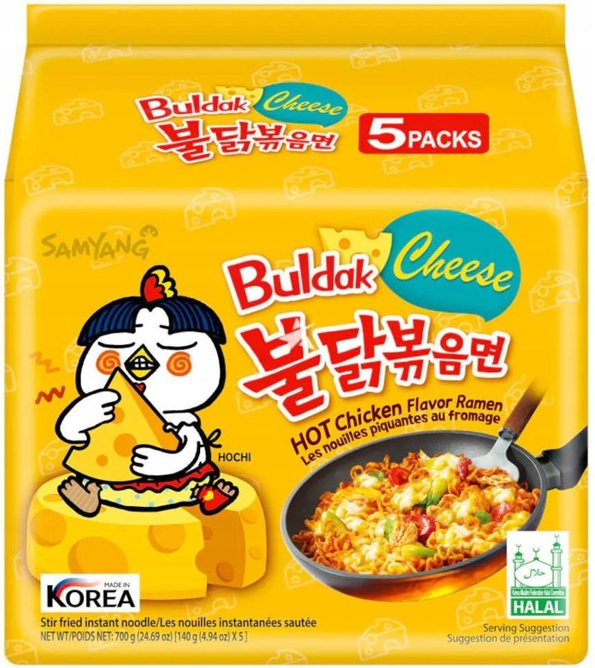 Zupka Instant SAMYANG Ramen Hot Chicken Cheese Buldak 5x 140g Cechy produktu Wyjątkowy smak ✅ Autentyczny koreański produkt Szybkie i łatwe przygotowanie ✅ Producent: Samyang Waga netto: 140g (1 sztuka) - 5 sztuk w opakowaniu zbiorczym ✅ Pochodzenie: Korea Południowa Samyang Buldak Cheese Ramen to wyjątkowy koreański makaron instant, który łączy intensywną ostrość z kremowym smakiem sera. Idealny dla miłośników orientalnych smaków i wyrazistych potraw. Ostre i kremowe połączenie smaku sera i pikantnego kurczaka ⭐ Intensywna ostrość: Pikantny sos buldak podkreśla charakter dania, ideal0ny dla fanów ostrych potraw. Kremowy serowy akcent: Delikatny smak sera równoważy pikantność, nadając daniu wyjątkowego charakteru. Wygodne porcje: Opakowanie zawiera 5 porcji po 140 g – doskonałe na szybki obiad, kolację lub przekąskę. Koreańska autentyczność: Produkt oryginalnie wytwarzany w Korei, odzwierciedlający tradycyjne smaki azjatyckiej kuchni. Wygoda i szybkie przygotowanie: Gotowe w zaledwie kilka minut, idealne dla osób ceniących szybkie i smaczne posiłki. Spróbuj SAMYANG Ramen Hot Chicken Cheese i odkryj niepowtarzalny smak koreańskiej kuchni w swoim domu! Przygotowanie Zagotuj 600 ml wody i dodaj makaron. Gotuj przez 5 minut. Odcedź wodę, pozostawiając 8 łyżek stołowych w garnku. Dodaj płynny sos i smaż przez 30 sekund. Posyp proszkiem serowym, wymieszaj i gotowe! Uwaga! Produkt jest bardzo pikantny, dlatego nie jest zalecany dla małych dzieci oraz osób wrażliwych na ostre potrawy. Składniki Makaron(73,1%): mąka pszenna (gluten), zmodyfikowana skrobia z tapioki, olej palmowy, zmodyfikowana skrobia ziemniaczana, sól, emulgator: E322 (soja), ekstrakt z cebuli, regulator kwasowości: E330, E339, E500, E501, tokoferol, olejek smakowy (zielona herbata), barwnik: E101. Zupa(24,1%): woda, sos serowy (20%): ser (mleko), mleko, czosnek, sos sojowy (soja, pszenica, regulatory kwasowości), cukier, chilli w proszku (4%), cebula, ekstrakt z chili (0,6%), ekstrakt z papryki, pieprz czarny (0,3%), curry w proszku, Lactobacillus fermentum. Przyprawy(2,9%): mozzarella w proszku (77%), sezam prażony, prażone wodorosty. Samyang To znana koreańska marka oferująca najwyższej jakości makaronyinstant i przyprawy. Ich produkty słyną z unikalnych połączeń smakowych, które zachwycają miłośników ostrej i intensywnej kuchni na całym świecie.