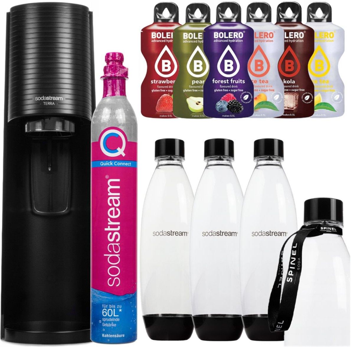 Sodastream Terra Black Jedna Butelka + Butelki 1l Fuse Dwupak Czarne + Smycz Do Butelki Spinel + Bolero Barczewo