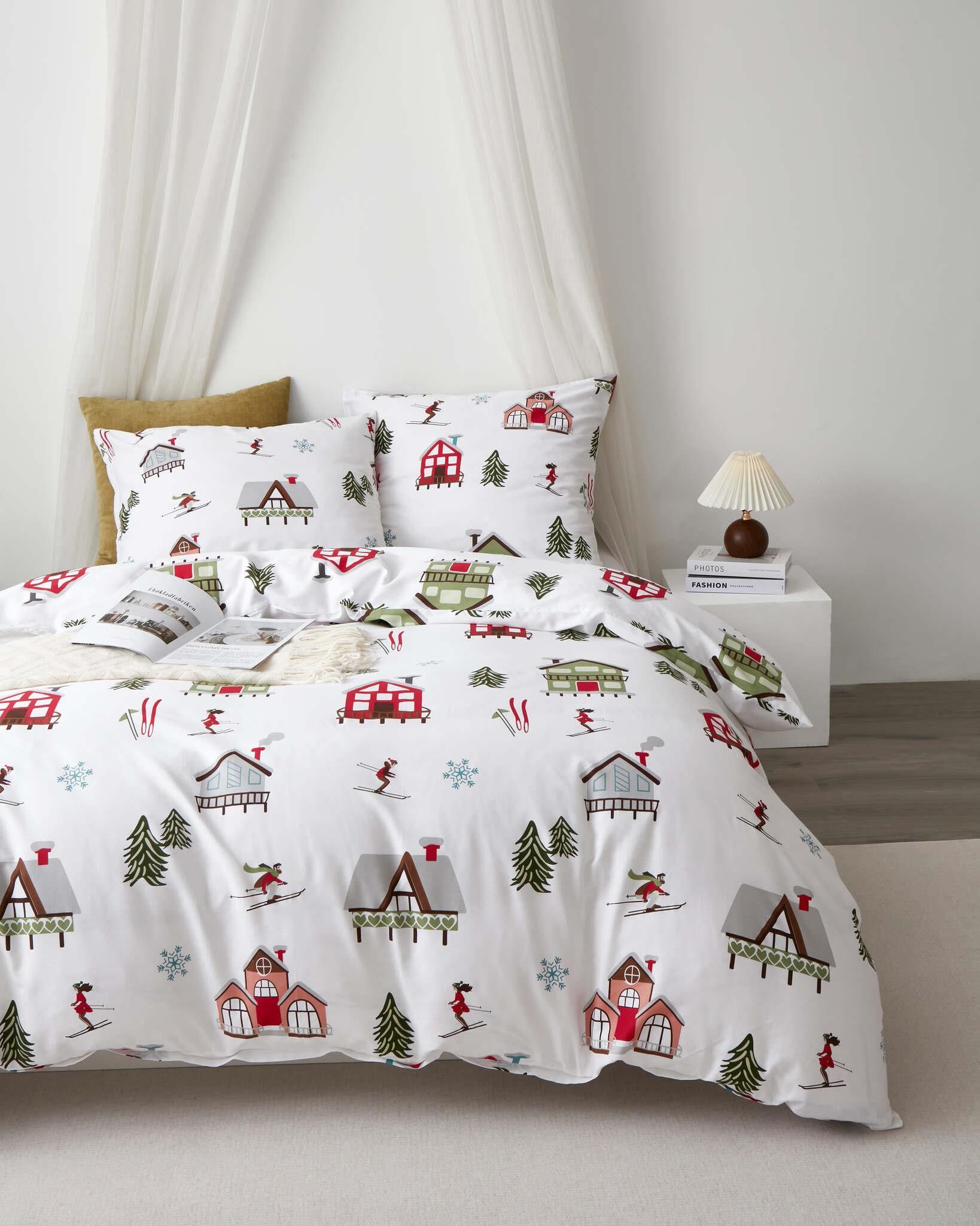 Spod Igły I Nitki Pościel Świąteczna Satyna Bawełniana Skiing 160X200 Biała Wielokolorowy Nadruk Narciarze Szusujący W Zimowym Krajobrazie Barczewo