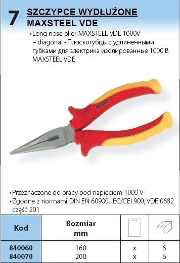 Szczypce Wydłużone VDE 1000V 200mm Fatmax Stanley Przeznaczone do pracy pod napięciem 1000 V Bimateriałowa komfortowa rękojeść o specjalnym kształcie chroniącym dłonie Zgodne z normami DIN EN 60900, IEC/CEI 900, VDE 0682 część 201 Wykonane z wysokogatunkowej stali, hartowane indukcyjnie Polerowane szczęki pokryte powłoką niklowo-chromową, zabezpieczającą przed korozją Indywidualnie testowane pod napięciem 10 000 V Parametry: Długość (mm): 200 Typ: Wydłużone Przeznaczenie: Praca pod napięciem Stanley to 165 lat tradycji, doświadczenia i innowacyjnych rozwiązań w konstruowaniu narzędzi ręcznych. Jako największa na świecie marka narzędziowa, Stanley ma ogromne doświadczenie we wprowadzaniu i produkcji narzędzi, spełniających wysokie oczekiwania dzisiejszych użytkowników. Sukces firmy opiera się na ciągłym kontakcie z Klientami oraz analizowaniu ich potrzeb, aby następnie w oparciu o te informacje - rozwijać ofertę produktów i tworzyć jeszcze lepsze narzędzia.