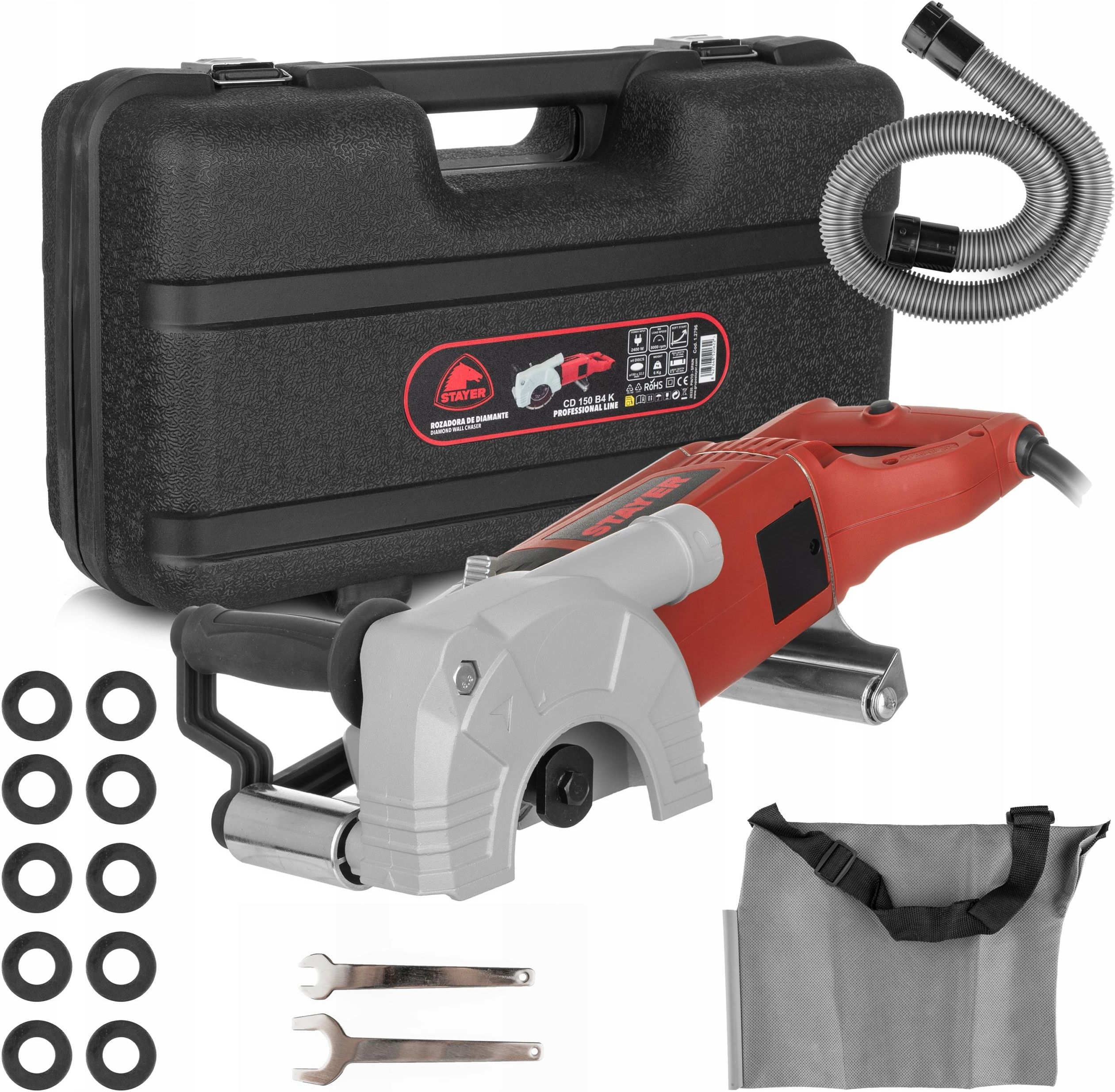 STAYER CD 150 B4 K Bruzdownica z możliwością pracy 4 tarczami diamentowymi Cechy produktu Brak konieczności kucia przy instalacjach – Możliwość pracy z 4 tarczami diamentowymi pozwala na wykonanie bruzd 25 mm bez potrzeby użycia dłuta, a przy 35 mm znacząco redukuje konieczność dodatkowej obróbki w zależności od materiału. Wszechstronność zastosowań – Regulowany system cięcia dzięki możliwości różnej konfiguracji tarcz i dołączonych podkładek. Czystsze miejsce pracy – Przystosowanie do podłączenia odkurzacza zapewnia skuteczne odsysanie pyłu. Precyzyjna głębokość cięcia – Regulator głębokości umożliwia dokładne ustawienie cięcia w zakresie 8–43 mm. Bezpieczna i komfortowa praca – Wyłącznik typu paddle zapewnia wygodne i pewne użytkowanie. Oszczędność czasu przy konserwacji – Zewnętrzna wymiana szczotek bez konieczności demontażu narzędzia. Płynny start – Funkcja progresywnego rozruchu zabezpiecza mechanizm i użytkownika przy uruchamianiu urządzenia. Stabilna praca na powierzchni – Rolki prowadzące umożliwiają łatwe i precyzyjne prowadzenie urządzenia w linii cięcia. Wyposażenie standardowe Rękojeść boczna Rolki prowadzące Wąż do odsysania pyłu Worek na pył Podkładka dystansowa 3 mm - 10 sztuk Flansze do tarcz Walizka transportowa Dane techniczne Moc: 2400 W Prędkość obrotowa bez obciążenia: 8000 obr/min Średnica tarczy: ø150 mm Szerokość cięcia: 7–35 mm Głębokość cięcia: 8–43 mm Waga: 6 kg STAYER to hiszpańska marka z ponad 60-letnim doświadczeniem w branży elektronarzędzi obecna w ponad 70 krajach. Misją firmy jest projektowanie narzędzi dla profesjonalistów, które wykorzystują najnowocześniejsze technologie, gwarantując wysoką wydajność, co prowadzi do dostarczania najlepszych rozwiązań swoim klientom. Dzięki własnym, nowoczesnym zakładom produkcyjnym i zaawansowanym laboratoriom badawczym, każdy produkt STAYER przechodzi rygorystyczne testy jakości i wytrzymałości, spełniając najwyższe europejskie normy. Firma stawia na innowacje, zrównoważony rozwój i odpowiedzialność społeczną – korzysta z odnawialnych źródeł energii, optymalizuje opakowania i minimalizuje zużycie plastiku. Dzięki czemu narzędzia STAYER nie tylko ułatwiają pracę, ale także dbają o środowisko. Wybierając STAYER, wybierasz profesjonalizm, trwałość i doskonały stosunek jakości do ceny – narzędzia stworzone, by sprostać najbardziej wymagającym zadaniom.