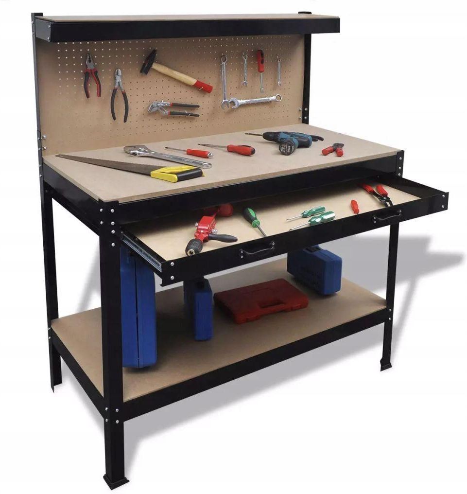 vidaXL Blat roboczy z tablicą na narzędzia i szufl vidaXL Metalowy stół będzie idealny zarówno dla profesjonalistów, jak i amatorów majsterkowania. Duża szuflada zapewnia dużo miejsca do przechowywania wszelkiego rodzaju narzędzi i akcesoriów. A Toje narzędzia mogą być wyraźnie rozłożone i zawsze w zasięgu ręki dzięki praktycznej desce z haczykami. Na dolnej półce można umieścić nieporęczne narzędzia. Dzięki dużej i stabilnej powierzchni roboczej możesz efektywnie pracować na jeszcze większych przedmiotach. Wykonanie z wysokiej jakości stali i płyty MDF sprawi, że blat będzie stabilny i trwały. Dzięki załączonym akcesoriom, montaż będzie bardzo prosty. Kolor: Array Metalowy stół będzie idealny zarówno dla profesjonalistów, jak i amatorów majsterkowania. Duża szuflada zapewnia dużo miejsca do przechowywania wszelkiego rodzaju narzędzi i akcesoriów. A Toje narzędzia mogą być wyraźnie rozłożone i zawsze w zasięgu ręki dzięki praktycznej desce z haczykami. Na dolnej półce można umieścić nieporęczne narzędzia. Dzięki dużej i stabilnej powierzchni roboczej możesz efektywnie pracować na jeszcze większych przedmiotach. Wykonanie z wysokiej jakości stali i płyty MDF sprawi, że blat będzie stabilny i trwały. Dzięki załączonym akcesoriom, montaż będzie bardzo prosty. Materiał: stalowa rama + MDF Wymiary całkowite: 115 x 55 x 140 cm (szer. x gł. x wys.) Wymiary szuflady: 108 x 41,5 x 6,5 cm (szer. x gł. x wys.) Wysokość dolnej półki nad ziemią: 27,5 cm Wysokość robocza: 91 cm Maksymalne obciążenie: 150 kg Z dużą szufladą i tablicą na narzędzia Solidna metalowa konstrukcja Gumowe nogi dla lepszej stabilności W skład przesyłki wchodzi blat roboczy i 12 haków Kolor: Array vidaXL