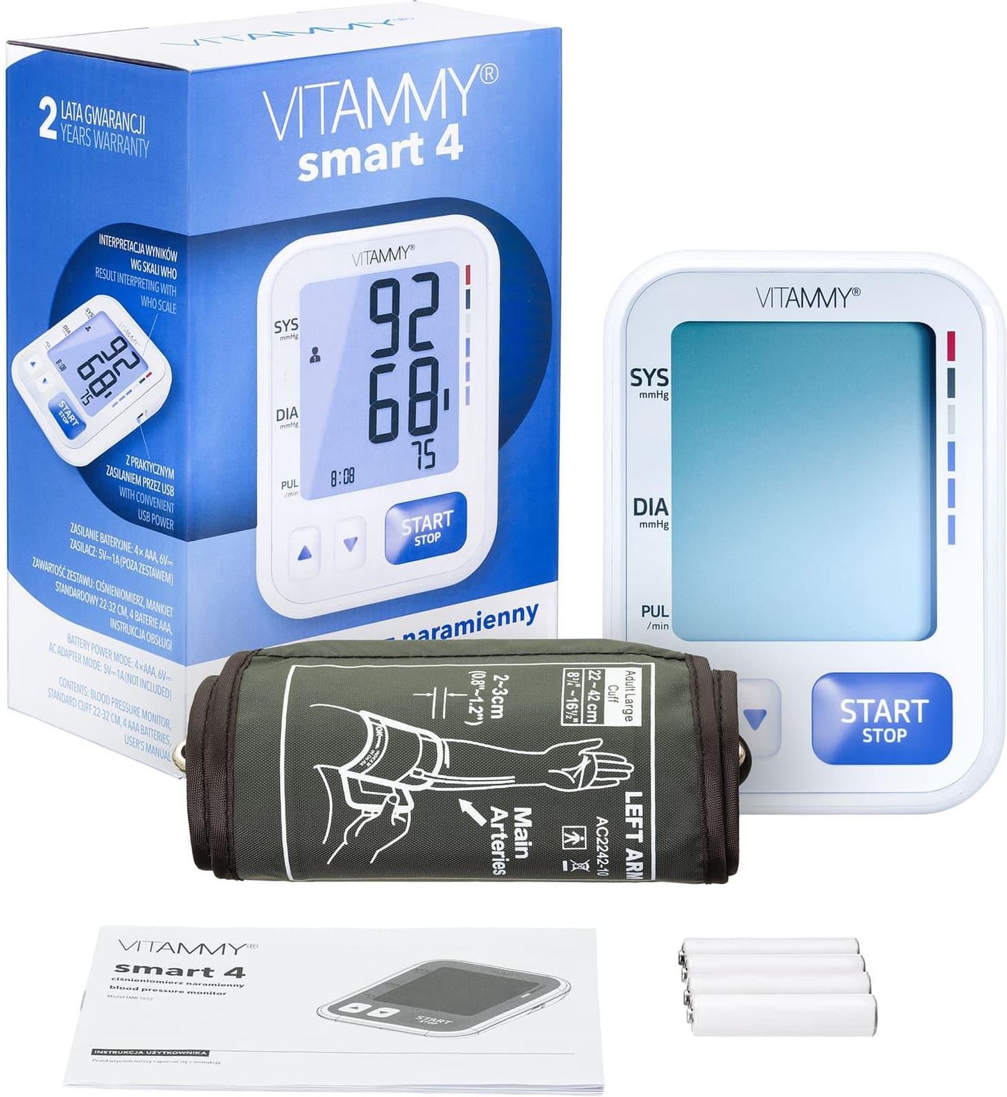 Seria ciśnieniomierzy VITAMMY Smart Ciśnieniomierze naramienne VITAMMY Smart 2, 4, 6 i 8 to seria inteligentnych ciśnieniomierzy naramiennych o różnej wielkości i konstrukcji. Większe i stabilne - dostosowane do użytku domowego oraz mniejsze - lekkie i przenośne, żebyś mógł mieć urządzenie zawsze ze sobą. Który ciśnieniomierz VITAMMY Smart wybrać? SMART 2 - Ekonomiczny, lekki, poręczny. Idealna propozycja dla początkujących. Zachęcająca cena, prosta obsługa i lekka konstrukcja. SMART 4 - Kompaktowy, ultralekki z kontrastowym ekranem. Idealny w podróży, na wakacje, do torebki. SMART 6 - Duży, stabilny, wygodny do codziennego użytkowania. Polecany osobom, które mają duże oczekiwania, a nie lubią przepłacać. SMART 8 - Duży, stabilny z kolorowym wyświetlaczem. Mocna konstrukcja i wyraźny, duży ekran to idealne rozwiązanie do regularnego domowego użytkowania. Technologia trzeciej generacji – delikatny i szybki pomiar już w trakcie pompowania mankietu. Poznaj technologię, która sprawi, że pomiar będzie zdecydowanie szybszy i delikatniejszy. Urządzenie dokonuje pomiaru już w trakcie pompowania mankietu. Działanie takie niweluje zbyt intensywny ucisk i zapewnia znacznie delikatniejsze odczucia. Mniejszy ucisk to mniejszy dyskomfort i spokojniejszy przebieg badania, co przekłada się na bardziej wiarygodny wynik. Wykrywanie nieregularnego rytmu serca Zyskaj więcej! Dokonując codziennego badania ciśnienia tętniczego krwi z ciśnieniomierzem VITAMMY Smart 4, równocześnie sprawdzasz, czy praca Twojego serca jest miarowa. Wczesne wykrycie zaburzeń rytmu to szansa na szybkie wdrożenie leczenia i zapobieganie powikłaniom. Pamięć 2 x 60 wyników z czasem i datą pomiaru Zadbaj o siebie i swoich bliskich! Systematyczność to podstawa do osiągniecie zamierzonego celu. Jeśli systematyczność nie jest Twoją mocną stroną, to wybierz ciśnieniomierz VITAMMY Smart 4, który ułatwi Ci wykonywanie regularnych badań i dodatkowo będzie prowadził za Ciebie dzienniczek kontroli w pamięci urządzenia. Uśrednianie ostatnich trzech wyników pomiarów Jakie są Twoje tendencje? Masz raczej wysokie czy niskie ciśnienie? Jeśli ocena tych wartości sprawia Ci trudność, to wybierz ciśnieniomierz VITAMMY Smart 4, który zrobi to za Ciebie. Urządzenie, uśrednia ostatnie trzy wyniki pomiaru co ułatwi Ci ocenić w jakim przedziale mieszczą się Twoje wyniki. Przejrzysta skala na wyświetlaczu wskaże Ci czy odczytany wynik mieści się w normach zatwierdzonych przez Światową Organizację Zdrowia (WHO). Ciśnieniomierz naramienny VITAMMY Smart 4 najwyższy komfort użytkowania Co sprawia, że użytkowanie ciśnieniomierz VITAMMY Smart 4 jest tak wygodne i bezproblemowe? Urządzenia te wyróżnia niezwykle prosta, intuicyjna obsługa za pomocą jednego przycisku. Wynik pomiaru, zostanie wyświetlony na czytelnym, przejrzystym ekranie z kontrastowym podświetlaniem. Co więcej urządzenie samo się wyłączy po chwili spoczynku. To rozwiązanie, który zapewnia oszczędzanie baterii. Możliwość zasilanie przez USB - powszechnie dostępne i ekologiczne Jeśli cenisz sobie ekologię to na pewno ucieszy Cię możliwość zasilania ciśnieniomierza przez złącze USB. To potrójna korzyść! Nie musisz pamiętać o wymianie baterii, dbasz o środowisko, a Twój ciśnieniomierz jest zawsze gotowy do pracy. Polska marka VITAMMY - otrzymujesz znacznie więcej niż produkt VITAMMY to polska marka. Dbamy o to, aby nasze produkty spełniały potrzeby lokalnych odbiorców i pomagały rozwiązywać aktualne problemy. Zapewniamy polskie opisy, instrukcję w języku polskim oraz kontakt z Infolinią Pomocy i Wsparcia Technicznego w języku polskim. Pozostajemy w kontakcie: Wsparcie i Pomoc Infolinii 887 11 00 66 Masz pytania dotyczące wyboru produktu, jego użytkowania, masz wątpliwości, potrzebujesz wsparcia - skontaktuj się z profesjonalną Infolinią Pomocy i Wsparcia Techniczego VITAMMY. Gwarancja jako obietnica jakości VITAMMY Ciśnieniomierz VITAMMY Smart 2 objęty jest 2-letnią gwarancją w ramach OBIETNICY JAKOŚCI VITAMMY, która obejmuje zapewnienie jakości technicznej urządzenia, wartości pomiarowej i użytkowej urządzenia, jak i wsparcia użytkownika w zakresie obsługi i rozwiązywania problemów, a także dostępności akcesoriów. Jak poprawnie dokonanać badania ciśnienia krwi? Na wiarygodny wynik pomiaru ma wpływ bardzo wiele czynników. Nawet będąc w posiadaniu doskonałej jakości urządzenia pomiarowego Twój wynik może nie być miarodajny, z uwagi na popełniane błędy podczas badania. Oto kilka przydatnych wskazówek przed przystąpieniem do wykonania pomiaru ciśnienia krwi. Przed pomiarem odpocznij 5 minut. Przed kolejnym pomiarem odczekaj 3 minuty. W ten sposób pozwolisz, aby cyrkulacja krwi unormowała się. Pomiar należy wykonywać w cichym miejscu lub pokoju. Przed i podczas pomiaru należy się zrelaksować, w trakcie wykonywania badania nie należy mówić, ani się poruszać. Środek mankietu powinien znajdować się na wysokości prawego przedsionka serca. Przed rozpoczęciem pomiaru, rozsiądź się wygodnie, nie krzyżując nóg, ustawiając stopy płasko na podłożu. Plecy i ręce powinny być podparte. Aby uzyskiwać porównywalne wyniki, staraj się mierzyć ciśnienie w podobnych warunkach. Na przykład mierz codziennie o tej samej porze i zachowując to samo ułożenie ręki lub w sposób zalecany przez lekarza. VITAMMY power micro to certyfikowany zasilacz do urządzeń medycznych, którego zgodność została oceniona zgodnie z wymogami medycznej certyfikacji CE, w tym wymogami bezpieczeństwa określonymi przez normę IEC 60601-1 Dedykowany do ciśnieniomierzy VITAMMY serii NEXT: 1, 5 oraz 9 Z wtyczką microUSB Ze zintegrowanym przewodem Zapewnia podwójną izolację Zapewnia bezpieczeństwo użytkownika / pacjenta Zapewnia stabilną, niezakłóconą pracę urządzeń medycznych oraz wiarygodne, d