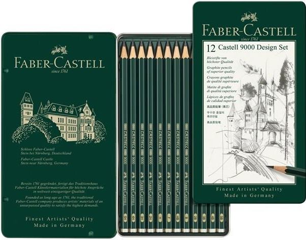 Ołówek zestaw design, metalowe opakowanie 12 szt.(2b, 3b, 4b, 5b, b, hb, f, h, 2h, 3h, 4h, 5h) Zestaw ołówków grafitowych Castell 9000 Faber-Castell Design 12 szt. w kolorze zielonym w opakowaniu metalowym. Kultowe i klasyczne – sześciokątne ołówki najwyższej jakości z wieloletnią tradycją. Wprowadzone na rynek przez hrabiego Alexandra von Faber-Castell w 1905 roku. Ich jakość i precyzyjnie stopniowane stopnie twardości sprawiły, że stały się ulubieńcem artystów i ilustratorów. Odpowiednie nie tylko do pisania, ale też szkicowania i rysowania. Z odpornym na pękanie grafitem o stopniu twardości 2B, 3B, 4B, B, HB, F, H, 2H, 3H, 4H, 5H, 6H dzięki bezpiecznemu procesowi wiązania (SV). Wykonane z certyfikowanego, miękkiego drewna pochodzącego ze zrównoważonego i odpowiedzialnie zarządzanego leśnictwa. Powierzchnie pokryte lakierem na bazie wody – bezpiecznym dla środowiska i zdrowia. Dostępne w 12 różnych stopniach twardości, co czyni je idealnym ołówkiem do wszystkich zastosowań technicznych i artystycznych. Każdy ołówek jest opatrzony kodem kreskowym. W zestawie 12 szt. ołówków (2B, 3B, 4B, 5B, B, HB, F, H, 2H, 3H, 4H, 5H), metalowe opakowanie