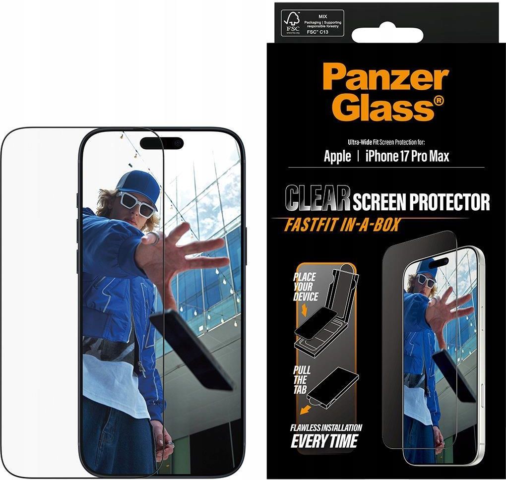 Szkło hartowane PanzerGlass Clear Ultra-Wide Fit Fastfit Apple iPhone 17 Pro Max Wersja kolorystyczna: Black (przezroczysta z czarną ramką) Materiał: hartowane szkło z recyklingu Zakres ochrony: niemal całkowite pokrycie ekranu Szybka instalacja dzięki aplikatorowi Fastfit - prosto, łatwo, bez …