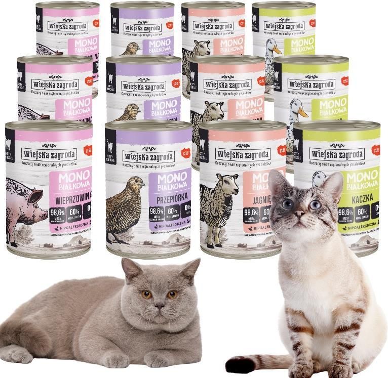 Wiejska Zagroda Monoproteinowa Mokra Karma Dla Dorosłych Kotów Kaczka 12 x 400 g Poznajcie monoproteinowe karmy mokre Wiejska Zagroda dla kota. Każda puszka zawiera jeden rodzaj mięsa, które plasuje się na pierwszym miejscu każdego składu! Karmy stanowią świetny wybór dla wybrednych pupili. Podając naprzemiennie różne źródła białek obserwujemy, którymi najchętniej zajada się nasz Czworonożny Przyjaciel. Idealnie sprawdzą się dla wrażliwych mruczków oraz tych, które zmagają się z alergiami pokarmowymi – podawanie kotu karmy tylko z jednym, określonym typem białka pozwala na obserwacje jego zachowania oraz kondycji skóry. Dzięki temu łatwo można wykluczyć składniki, które powodują niepożądane reakcje. Szeroki wybór mięs sprawia, że każdy kot znajdzie w naszym menu coś dla siebie! Główne zalety produktu: mięso na pierwszym miejscu w składzie – aż 60% w składzie! 98,6% mięsa, podrobów i bulionu niski poziom węglowodanów – od 1,7% do 2,9% w suchej masie w zależności od formuły bez zbóż, bez glutenu bez dodatku zbędnych warzyw i owoców zawiera 2400 mg/kg tauryny dokładnie opisany, prosty i krótki skład polska marka