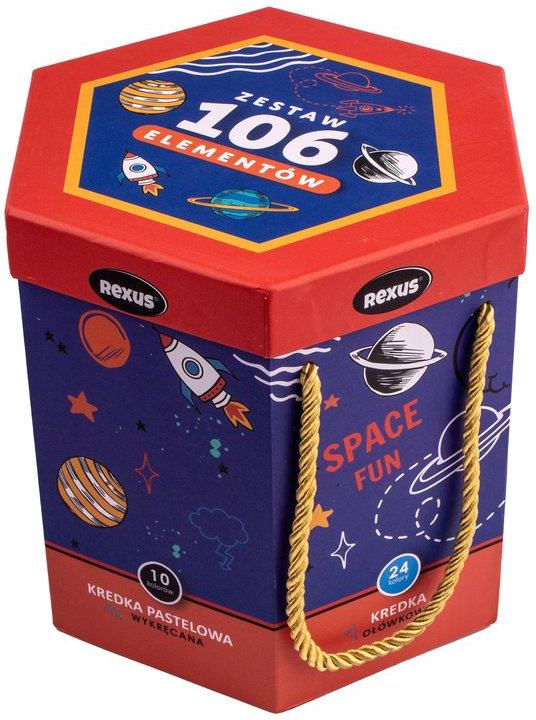 Zestaw artystyczny 106 elementów chłopiec Zapakowany jest w 6-kątne pudełko, które się rozkłada ukazując 6 trójkątnych pojemników. Każdy z nich ma inną zawartość. Zestaw składa się z: 16 dwustronnych markerów okrągłych, 10 dwustronnych markerów trójkątnych, 18 mazaków z pędzelkową końcówką, 10 wykręcanych kredek pastelowych, 24 kredek ołówkowych, 12 markerów punktowych. Ponadto po otwarciu pudełka ukazuję się 16 naklejek. Zestaw dostępny w dwóch wariantach kolorystycznych - dla chłopca i dziewczynki, na tej stronie znajduje się zestaw dla chłopca. Kolorowy zestaw malarski to idealny prezent dla każdej pociechy lubiącej rysować i kolorować!Zestaw zawiera wszystkie niezbędne elementy do tworzenia przepięknych rysunków, tj. kredki, pisaki, pastele.Ogromna gama kolorów pozwoli na wiele różnorodnych obrazów. Twoje dziecko szybko się nie znudzi!