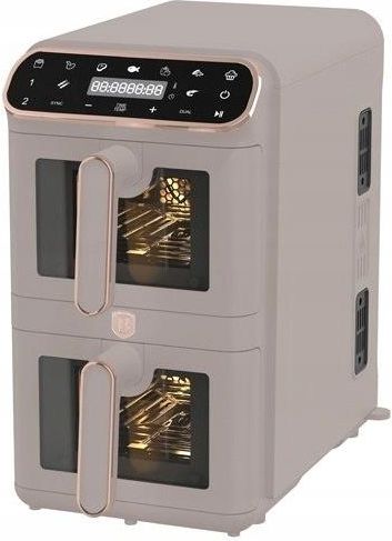 Air fryer Frytkownica beztłuszczowa double 11L (5,5 + 5,5L) BerlingerHaus Taupe BH-9804 Frytkownica beztłuszczowa BerlingerHaus Taupe o pojemności 11L (5,5 + 5,5L) to idealne urządzenie dla zdrowego i wygodnego gotowania. Wyposażona w cyfrowy wyświetlacz dotykowy LED, umożliwia precyzyjną kontrolę temperatury od 60 do 200℃. Dodatkowe funkcje, takie jak utrzymywanie ciepła, opóźniony start oraz automatyczne wyłączanie po wyjęciu kosza, zwiększają komfort użytkowania. Elegancki design z widocznym oknem sprawiają, że frytkownica wpasuje się w każdą kuchnię, oferując zdrowe gotowanie z minimalnym użyciem oleju. Antypoślizgowe nóżki zapewniają stabilność, a ochrona przed przegrzaniem gwarantuje bezpieczne użytkowanie. Specyfikacja Moc: 220-240 V ~ 50/60 Hz, 1650 W Kontrola temperatury: 60-200℃ Pojemność: 2 kosze na żywność 5,5 l + 5,5 l = 11l Tacka na olej i koszyk na żywność z powłoką zapobiegającą przywieraniu Kolor: szaro-beżowy Kolekcja: Tauoe Cechy Cyfrowy wyświetlacz dotykowy LED Widoczne okno Timer: Do 60 min Ochrona przed przegrzaniem Antypoślizgowe nóżki Funkcje utrzymywania ciepła i opóźnienia Funkcja automatycznego wyłączania po wyjęciu kosza Menu gotowania z przyciskiem skrótu dla każdego rodzaju potrawy (9 rodzajów) Zdrowy sposób gotowania bez oleju i tłuszczu, do 80% mniej tłuszczu