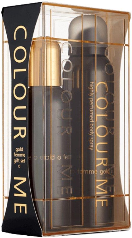 COLOUR ME 100ml EDP/150ml Body Spray Gift Set FEMME GOLD Colour Me Zestaw prezentowy COLOUR ME to idealne połączenie luksusowego wód toaletowych o pojemności 100 ml i odświeżającego sprayu do ciała 150 ml w eleganckim złotym opakowaniu. Ten wyjątkowy zestaw dedykowany jest kobietom, które cenią sobie zarówno subtelną elegancję, jak i intensywność zapachu. EDP utrzymuje skórę otoczoną zmysłowym aromatem przez wiele godzin, podczas gdy spray do ciała dodaje świeżości i lekkości w ciągu dnia. Doskonały jako prezent na każdą okazję, ten zestaw podkreśla kobiecość i sprawia, że chwile są niezapomniane. Zafunduj sobie lub bliskiej osobie odrobinę luksusu z COLOUR ME FEMME GOLD. Zestaw prezentowy COLOUR ME zawiera elegancki perfum o pojemności 100 ml oraz odświeżający spray do ciała o pojemności 150 ml, które razem tworzą idealne połączenie dla kobiet preferujących subtelne i zmysłowe zapachy. Zapach FEMME GOLD to doskonała kompozycja, która podkreśla kobiecą siłę i pewność siebie. Dzięki swojej uniwersalności nadaje się na każdą okazję, zarówno na co dzień, jak i na wieczorne wyjścia. Specjalnie zaprojektowane opakowanie sprawia, że zestaw doskonale nadaje się na prezent, wyrażając elegancję i luksus. Niech COLOUR ME stanie się nieodłącznym elementem Twojej codziennej pielęgnacji i stylu. Odkryj moc zapachów i pozwól sobie na chwilę relaksu oraz przyjemności. Benzyl Salicylate (115-58-1), Limonene (5989-27-5), Alpha-Isomethyl Ionone (127-51-5), Hydroxycitronellal (107-75-5), Hexyl Cinnamal (101-86-0), Coumarin (91-64-5), Citronellol (106-22-9), Linalool (78-70-6), Benzyl Benzoate (120-51-4), Citral (5392-40-5), Farnesol (4602-84-0), Benzyl Alcohol (100-51-6), Geraniol (106-24-1)