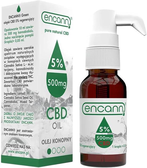 Najniżej stężony olej Encann. Opakowanie 30 ml zawiera 1500 mg kannabidiolu. Jedno naciśnięcie pompki dozuje kroplę o wielkości 0,05 ml w której znajduje się około 2,5 mg CBD. Łączna ilość kropel w zestawie 30 ml jest równa 600. Olejek zawiera szerokie spektrum naturalnych związków występujących w konopiach siewnych Cannabis Sativa L.- m. in. terpeny, kannabinoidy i dobroczynne kwasy tłuszczowe. Nie zawiera THC. Zawartość CBD potwierdzona laboratoryjnie. Stosowanie: Odpowiednią ilość produktu nanosić miejscowo 1-2 dziennie na błony śluzowe jamy ustnej. Stosować w zależności od potrzeb. Stosować maksymalnie dwa razy dziennie, nie więcej niż 0,5 g produktu na dzień. Wszystkie składniki użyte do produkcji oleju mają w pełni naturalne pochodzenie, natomiast każda partia przebadana na etapie produkcji. Produkty ENCANN zapakowane są w butelki z ciemnego szkła, które nie reaguje z olejem w środku. Za pomocą wygodnego dozownika możesz dokładnie odmierzać ilość kropel. Zalecamy przechowywanie oleju ENCANN w chłodnym i zaciemnionym miejscu lub w lodówce. Na pudełku znajdują Państwo informacje w języku polskim oraz angielskim. Składnikami olejku Encann® Green 5% CBD regenerujący są wyłącznie produkty pochodzenia naturalnego. Tłoczony na zimno olej z nasion konopi, kannabinoidy pochodzący z rośliny Cannabis Sativa L. potocznie nazywaną konopią siewną oraz terpeny konopne, które nadają naszym produktom niespotykany dotąd efekt synergii. Ingredients: Cannabis Sativa Seed Oil, Cannabidiol, Mixed Terpenes. Olejek wyprodukowano w zakładzie spełniającym normy ISO 9001, Hazard analysis and critical control points (HAACP) oraz Good Manufacturing Practice (GMP). Składniki, które zostały użyte w naszym olejku to w 100% produkty pochodzenia naturalnego przetworzone w warunkach rygorystycznej i surowej kontroli.