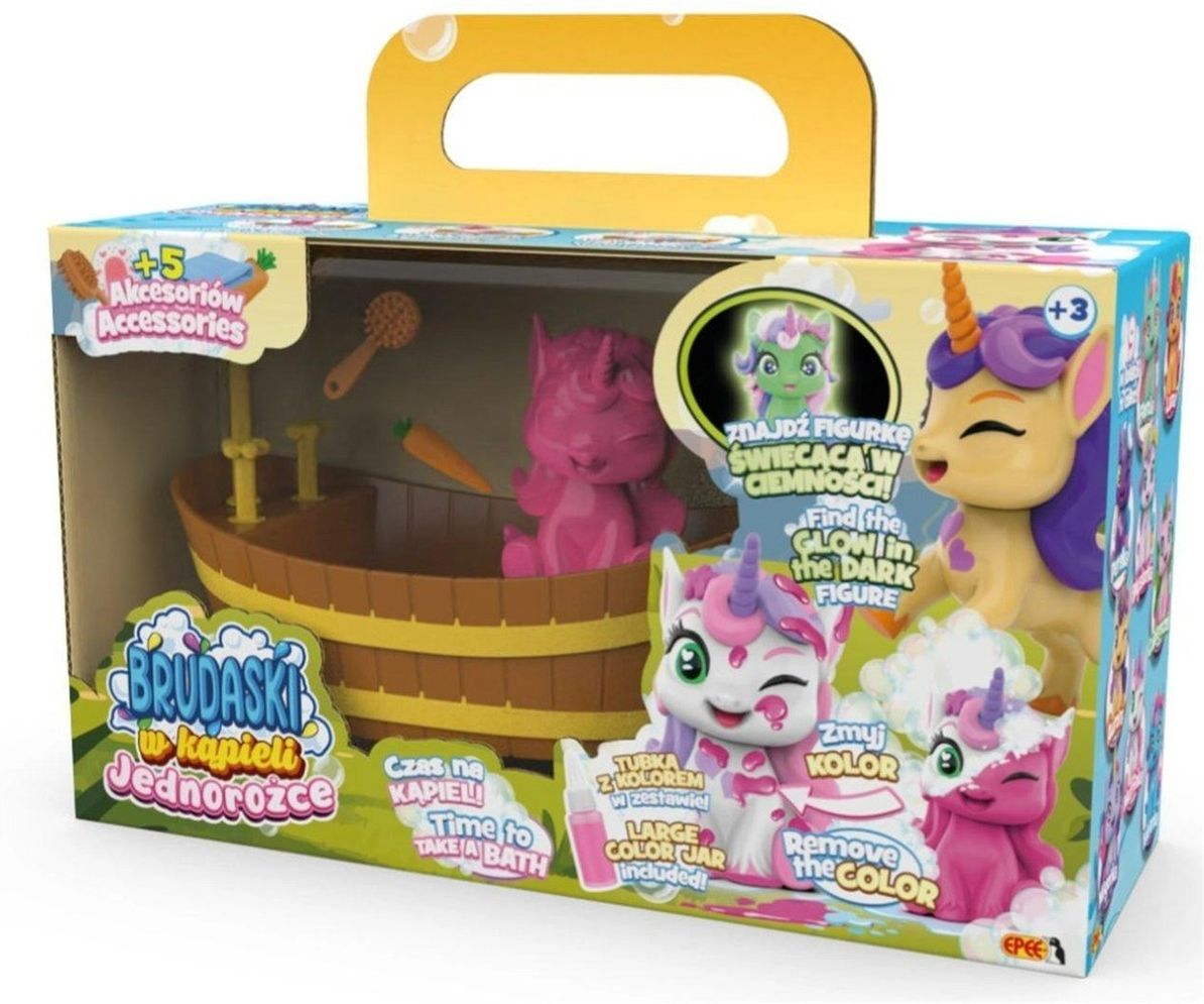 Brudaski w kąpieli Jednorożce Zestaw Łazienka jednorożec Muffinka Epee Zapraszamy do świata pełnego magii, kolorów i nieskończonej zabawy! Ta wyjątkowa kolekcja uroczych jednorożców to idealna propozycja dla dzieci, które uwielbiają kreatywne i interaktywne zabawki. Zabawa, która nigdy się nie kończy! Jednorożca można ubrudzić specjalnym różowym błotkiem, a następnie wykąpać i znów rozpocząć zabawę. Dzięki temu dziecko może tworzyć własne scenariusze i cieszyć się zabawką każdego dnia na nowo! Wanienka z natryskiem – jeszcze więcej frajdy! Dołączona wanienka z natryskiem sprawia, że mycie jednorożca staje się jeszcze bardziej realistyczne i wciągające. To doskonały element zabawy w pielęgnację i opiekę nad magicznym pupilem. Zbierz całą kolekcję! W serii dostępnych jest aż 9 uroczych jednorożców, a każdy z nich ma swój wyjątkowy wygląd i charakter. Dodatkowo możesz trafić na unikalnego jednorożca świecącego w ciemności, który zachwyca swoim magicznym efektem! Dlaczego warto wybrać ten zestaw? możliwość wielokrotnego brudzenia i mycia rozwija kreatywność, wyobraźnię i zdolności manualne aż 5 akcesoriów do zabawy i stylizacji realistyczna wanienka z natryskiem element niespodzianki – możliwość trafienia rzadkiego modelu idealna zabawka dla dzieci lubiących opiekę nad zwierzątkami Zawartość zestawu 1 figurka jednorożca 1 tubka z różowym błotkiem 5 akcesoriów 1 wanienka z natryskiem Kolor opakowania może się różnić! Wiek: 3+ Uwaga w zestawie może być unikalny świecący Jednorożec!