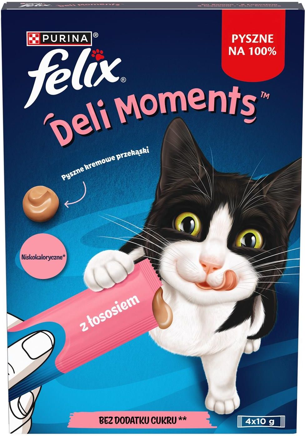 Felix Deli Moments Łosoś 4x10g Opis produktu Przedstawiamy przyjemny i zabawny sposób na przekąskę dla Twojego kota! Kremowe przekąski FELIX® Deli Moments™ mają płynną konsystencję, dzięki której możesz dzielić dłuższe chwile z Twoim kotem. Dzięki nieodpartemu smakowi i gęstej, gładkiej konsystencji, FELIX® Deli Moments™ sprawią, że Twój kot będzie zajęty jedzeniem przez dłuższy czas. Gotowe do podania niezależnie od nastroju Twojego kota czy okazji, te przekąski są wygodne w użyciu i łatwe do zjedzenia przez Twojego kota. To doświadczenie o nieodpartym smaku, które tak przyjemnie się podaje, jest niskokaloryczne i nie zawiera dodatku cukru. Składniki: Mięso i produkty pochodzenia zwierzęcego, ryby i produkty rybne (łosoś 4%), oleje i tłuszcze, produkty pochodzenia roślinnego, mleko i produkty mleczne, minerały. Składniki analityczne: wilgotność: 87,0%, białko: 4,0%, tłuszcz surowy: 3,5%, popiół surowy: 2,0%, włókno surowe: 0,3%, wartość energetyczna: 57,1kcal / 100g. Zalecenia żywieniowe Zalecana dzienna porcja pokarmowa dla przeciętnego dorosłego kota, ważącego ok. 4 kg, do 2 saszetek w ciągu dnia. Sugerowane sposoby podawania: przed otwarciem saszetki ostrożnie wyciśnij saszetkę od końca do końca, aby zapewnić idealnie wymieszany przysmak. Kremowe przekąski FELIX® Deli Moments™ można podawać na różne sposoby: bezpośrednio z saszetki, umieszczone w misce, z ręki, na łyżce, na podłodze lub jako dodatek do posiłku. Całą zawartość każdej saszetki należy podać w jednym posiłku. Zwierzę powinno mieć stały dostęp do czystej, świeżej wody do picia. Dla zdrowia Twojego kota, przestrzegaj zaleceń żywieniowych i ćwicz z nim codziennie. Podawanie kotu przekąsek powinno odbywać się pod nadzorem.