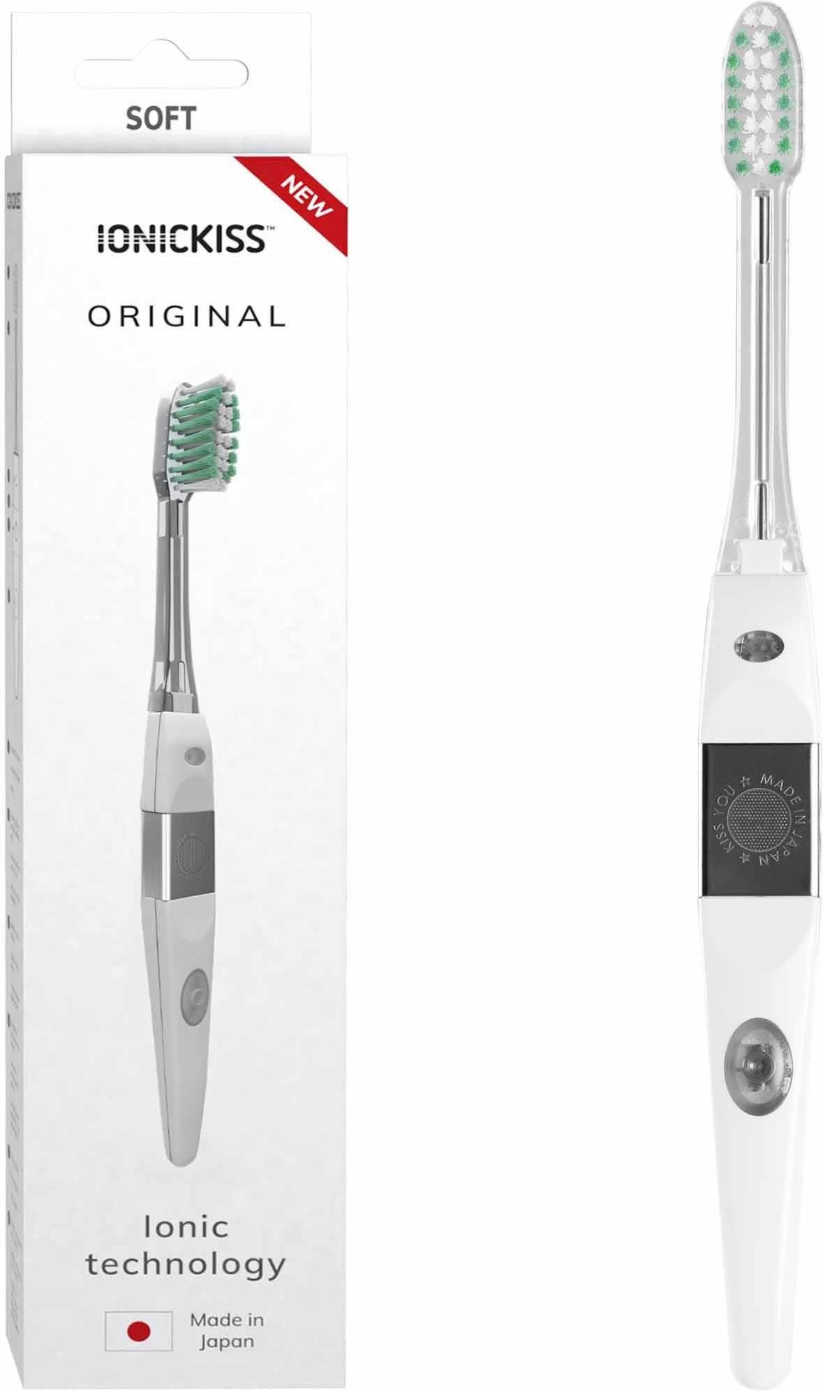 Jonowa szczoteczka do zębów IONICKISS Original Średnia Najbardziej efektywna manualna szczoteczka do zębów dzięki zastosowaniu technologii jonowej, która znacząco wpływa na usuwanie płytki nazębnej. Szczoteczka nie generuje hałasu, nie potrzebuje dodatkowego ładowania, dlatego możesz ją używać o każdej porze dnia i nocy, zarówno w domu, biurze jak i w podróży. Technologia Jonowa: Zastosowanie technologii jonowej w szczoteczkach IONICKISS polega na wygenerowaniu jonów, które niczym magnes powodują przyciągnięcie płytki nazębnej z powierzchni zębów do końcówki szczoteczki. Wytworzone jony nie tylko zwalczają płytkę nazębną, ale również skutecznie przeciwdziałają zapaleniu dziąseł i chorobom przyzębia, co zostało udowodnione klinicznie. Dodatkowo technologia jonowa pozwala na efektywne czyszczenie zębów bez konieczności stosowania pasty do zębów. Made in Japan Firma IONICKISS oferuje produkty wykonane w Japonii o najwyższym standardzie jakości, stale je udoskonalając poprzez zastosowanie w nich najnowszych rozwiązań technologicznych. Dodatkowe informacje: IONICKISS Original zawiera niewymienną baterię, która przy używaniu dwa razy dziennie przez dwie minuty starcza na około rok. Wodoodporny korpus pozwala na zanurzenie go wodzie do głębokości 1 metra nawet do 30 minut. Czerwona kontrolka świetlna przy naciśnięciu świecąc się na czerwono pozwala na potwierdzenie, że szczoteczka jest dalej w pełni funkcjonalna. Wymienna końcówka w zestawie: IONICKISS ŚredniaPrzeznaczona do codziennego mycia zębów dla osób o mniej wrażliwych dziąsłach. Umożliwia delikatne a za razem skuteczne czyszczenie. Posiada antybakteryjne włosie. Budowa końcówki szczoteczki pozwala na dokładne dotarcie do przestrzeni międzyzębowych oraz precyzyjne czyszczenie wzdłuż linii dziąseł. Wyprodukowana w Japonii, przy zachowaniu najwyższych standardów jakości. Stopień twardości włókien: Średni Kolor końcówki: Biały przezroczysty Kolor włosia: Biały Dentyści zalecają wymianę końcówki szczoteczki co 2-3 miesiące i zawsze po chorobie zakaźnej. Gwarancja 12 miesiące W zestawie: Rękojeść szczoteczki Końcówki: 1szt.
