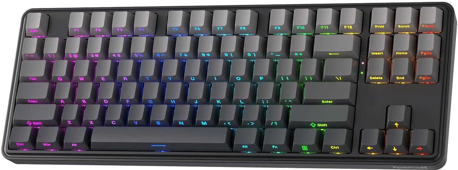 Redragon K707SP-RGB-PRO StarBlade to połączenie nowoczesnych technologii, wysokiej jakości wykonania i oryginalnego designu, które zadowoli zarówno graczy, jak i użytkowników ceniących komfort codziennej pracy. Klawiatura TKL (Tenkeyless) z 87 klawiszami została wyposażona w liniowe przełączniki Mint Mambo, które gwarantują płynność i precyzję działania. System hot-swap pozwala łatwo wymieniać przełączniki, technologia Gasket Mount i wielowarstwowe wygłuszenie minimalizują hałas, a boczny nadruk na gradientowych keycapach PBT (Polybutylene Terephthalate) dodaje wyjątkowego charakteru i trwałości. Gasket Mount i skuteczne wygłuszanie Redragon K707SP-RGB-PRO StarBlade wykorzystuje konstrukcję Gasket Mount, która eliminuje sztywne mocowanie klawiszy i zapewnia miękki, sprężysty skok. Warstwy materiałów wygłuszających oraz silikonowe podkładki dodatkowo redukują hałas, podnosząc komfort użytkowania w każdym środowisku. Każde naciśnięcie klawisza staje się przyjemnie ciche i satysfakcjonujące. To rozwiązanie, które docenią zarówno gracze nocni, jak i osoby pracujące w biurze. Przełączniki Mint Mambo i hot-swap Model StarBlade został wyposażony w liniowe przełączniki Mint Mambo, które dzięki fabrycznemu smarowaniu pracują płynnie i precyzyjnie. Funkcja hot-swap pozwala wymieniać switche bez konieczności lutowania, co umożliwia łatwe dostosowanie klawiatury do własnych potrzeb. Możesz wybrać przełączniki idealne do gier lub bardziej miękkie do pracy – wszystko zależy od Twoich preferencji. To klawiatura gotowa na personalizację na każdym etapie użytkowania. Side Printed Gradient PBT Keycaps Wytrzymałe keycapy z wysokiej jakości tworzywa PBT cechują się bocznym, gradientowym nadrukiem, który nie tylko świetnie wygląda, ale także jest odporny na ścieranie. Taki design sprawia, że klawiatura wyróżnia się na tle innych, a oznaczenia klawiszy pozostają czytelne nawet po długim czasie użytkowania. Boczne napisy poprawiają estetykę i nadają stanowisku unikalny charakter. To rozwiązanie dla osób, które cenią styl oraz trwałość w jednym.