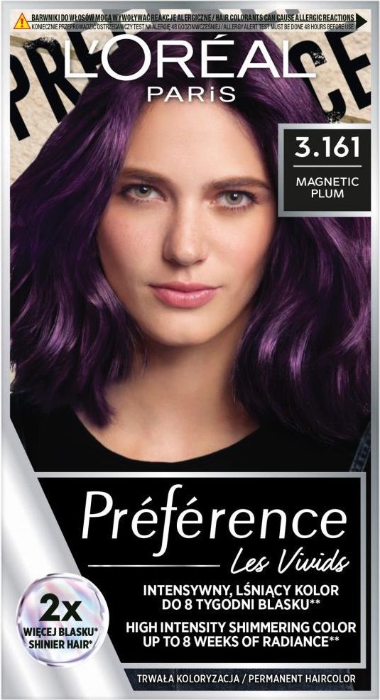 L'Oréal - Préférence - Les Vivids - Farba do włosów - 3.161 Magnetic Plum Préférence - Les Vivids - 3.161 Magnetic Plum marki L'Oréal. Farba do włosów. Stworzona z myślą o osobach, które chcą w zaciszu domowym uzyskać wyrazisty, przyciągający wzrok nowoczesny odcień pasm. Jej aplikacja jest szybka i prosta. Specjalnie dobrane barwniki w żelowej formule zapewniają intensywny, lśniący kolor, który utrzymuje się na włosach nawet do 8 tygodni. Dodatkowo odżywka po koloryzacji, która znajduje się w zestawie wzbogacona o filtry UV i pochodną witaminy E dba o strukturę włosów, zapobiegając ich przesuszeniu i matowieniu. Farba Loreal Preference Les Vivids dostępna jest w purpurowym odcieniu. Farba do włosów Loreal Preference Les Vivids. Łatwa w aplikacji. Utrzymuje się nawet do 8 tygodni. Wzbogacona o składniki pielęgnacyjne. OPAKOWANIE ZAWIERA:- 1x żel koloryzujący - 60 ml,- 1x krem utleniający - 90 ml,- 1x odżywka po koloryzacji - 54 ml,- 1x para rękawiczek,- 1x ulotka z instrukcją. Atrybuty Sposób użycia - Przestrzegać instrukcji użycia. Szczegółowe informacje dotyczące aplikacji znajdują się wewnątrz opakowania. Ostrzeżenia - ZALECENIA BEZPIECZEŃSTWABARWNIKI DO WŁOSÓW MOGĄ WYWOŁYWAĆ SILNE REAKCJE ALERGICZNE.Proszę przeczytać instrukcje i jej przestrzegać.Produkt nie jest przeznaczony dla osób poniżej 16 roku życia.TYMCZASOWE TATUAŻE NA BAZIE CZARNEJ HENNY MOGĄ ZWIĘKSZYĆ RYZYKO WYSTĄPIENIA ALERGII.Nie farbować włosów, jeśli:• na twarzy występuje wysypka lub skóra głowy jest wrażliwa, podrażniona i uszkodzona• kiedykolwiek wystąpiła reakcja na farbowanie włosów• w przeszłości wystąpiła reakcja na tymczasowy tatuaż na bazie czarnej henny.IGNOROWANIE ALERGII MOŻE SPOWODOWAĆ ZAGROŻENIE DLA ŻYCIA.Należy obowiązkowo przeprowadzić OSTRZEGAWCZY TEST NA ALERGIĘ KONIECZNIE 48 godzin przed każdym użyciem tego produktu, nawet jeśli wcześniej używałaś produktów do koloryzacji.Pamiętaj, aby kupić produkt 48 godzin wcześniej (przeczytaj i postępuj zgodnie z instrukcjami użycia znajdującymi się w ulotce).W przypadku reakcji alergicznej lub wątpliwości należy skontaktować się z lekarzem przed użyciem produktu do koloryzacji włosów.Mleczko (krem) utleniające zawiera nadtlenek wodoru.Krem (żel) koloryzujący zawiera: fenylenodiaminy, fenylenodiaminy (toluenodiaminy), rezorcynę, amoniak.• Stosować rękawice ochronne znajdujące się w pudełku.• Unikać kontaktu z oczami, nie stosować do farbowania rzęs lub brwi.• W przypadku dostania się preparatu do oczu, natychmiast przepłukać je wodą.• Dobrze spłukać włosy po użyciu.Odczekać 15 dni po zabiegu trwałej ondulacji lub trwałego wygładzania włosów (zastosowanie technologii tiolowej lub cysteinowej) przed aplikacją farby do włosów.• Nie używać, jeśli włosy były wcześniej farbowane henną lub koloryzacją progresywną.• Chronić przed dziećmi.PRZESTRZEGAĆ INSTRUKCJI UŻYCIA.Należy zapoznać się z listą składników. Pojemność (ml) - Żel koloryzujący - 60ml; Krem utleniający - 90 ml; Odżywka po koloryzacji - 54 ml PAO termin trwałości - 12M