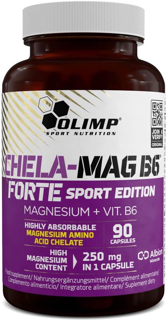 Wysoko przyswajalna forma magnezu – chelat aminokwasowy Albion™ Pomoc w prawidłowym funkcjonowaniu mięśni (magnez – chelat Albion™) Pomoc w zmniejszeniu uczucia zmęczenia i znużenia (magnez – chelat Albion™, witamina B6). Pomoc w prawidłowym funkcjonowaniu układu nerwowego (magnez – chelat Albion™, witamina B6). Pomoc w utrzymaniu prawidłowego metabolizmu energetycznego (magnez – chelat Albion™, witamina B6). Pomoc w utrzymaniu równowagi elektrolitowej (magnez – chelat Albion™). Olimp Chela-Mag B6® Forte Sport Edition – mięśnie w formie1, energia w normie2, zmęczenie pod kontrolą3 Trenujesz? Pracujesz umysłowo? Czujesz się przemęczony lub zestresowany? Sięgnij po wsparcie w postaci niewielkich, łatwych do połknięcia kapsułek z magnezem i witaminą B6 - Chela-Mag B6® Forte Sport Edition! To wysokiej jakości suplement marki Olimp Sport Nutrition, który wzbogaci Twoją codzienną dietę o wyżej wymienione, niezwykle cenne dla pracy mięśni, metabolizmu energetycznego i układu nerwowego składniki. Magnez i witamina B6 to sprawdzone połączenie, które często można spotkać w składzie suplementów diety. Oba składniki biorą udział w wielu procesach metabolicznych, stąd też są często polecane osobom zarówno aktywnym fizycznie, jak i umysłowo. Mięśnie w formie4, energia w normie5, zmęczenie pod kontrolą6? Wybierz Olimp Chela-Mag B6® Forte Sport Edition! Olimp Chela-Mag B6® Forte Sport Edition – właściwości magnezu i witaminy B6 Jak działa magnez z witaminą B6? Oba składniki korzystnie wpływają na: utrzymanie prawidłowego metabolizmu energetycznego, prawidłowe funkcjonowanie układu nerwowego, zmniejszenie uczucia zmęczenia i znużenia, utrzymanie prawidłowych funkcji psychologicznych. Ponadto magnez, który w suplemencie diety Olimp Chela-Mag B6® Forte Sport Edition występuje w formie wysoko przyswajalnego chelatu aminokwasowego Albion™, pomaga w: prawidłowym funkcjonowaniu mięśni, utrzymaniu równowagi elektrolitowej, prawidłowej syntezie białka, zachowaniu zdrowych kości i zębów. Witamina B6 natomiast przyczynia się do prawidłowego funkcjonowania układu odpornościowego, utrzymania prawidłowego metabolizmu homocysteiny, prawidłowej produkcji czerwonych krwinek, regulacji aktywności hormonalnej. Olimp Chela-Mag B6® Forte Sport Edition - zalety stosowania Realne udowodnione naukowo działanie składników. Wysoka przyswajalność magnezu, dzięki zastosowaniu formy hipoalergicznego, odpornego na kwaśne pH żołądka, łagodnego dla przewodu pokarmowego chelatu aminokwasowego Albion™. Dokładne dawkowanie – każda kapsułka suplementu diety Olimp Chela-Mag B6® Forte Sport Edition zawiera precyzyjnie odmierzone dawki magnezu i witaminy B6, co ułatwia suplementację. Wygoda stosowania – kapsułki są łatwe do przechowywania. Bez problemu zmieszczą się w specjalnym pillboxie. Niewielki słoik z kapsułkami Olimp Chela-Mag B6® Forte Sport Edition można również schować do podręcznej torby lub plecaka. Jak stosować Olimp Chela-Mag B6® Forte Sport Edition? Kapsułki z magnezem i witaminą B6 Olimp Chela-Mag B6® Forte Sport Edition są polecane przede wszystkim osobom aktywnym fizycznie i umysłowo. Z powodzeniem mogą je suplementować zarówno wyczynowi sportowcy, jak i amatorzy różnych dyscyplin sportowych. Po magnez i witaminę B6 często sięgają również m.in. pracownicy biurowi, studenci, programiści, nauczyciele. W przypadku suplementu Olimp Chela-Mag B6® Forte Sport Edition zaleca się stosować 1 kapsułkę dziennie po posiłku lub na około 1 godzinę przed snem. Kapsułkę należy popić dużą ilością wody. Należy pamiętać, aby suplementu nie traktować jako zamiennika diety. To wyłącznie dodatek do zróżnicowanego odżywiania. Olimp Chela-Mag B6® Forte Sport Edition – jakość, której warto zaufać Jakość jest pojęciem leżącym u podstaw całej koncepcji biznesowej definiującej firmę farmaceutyczną Olimp Laboratories. Tylko bezwzględne przestrzeganie surowych norm jakościowych jest w stanie zapewnić pełną satysfakcję ze stosowania suplementu diety marki Olimp Labs. Do jego produkcji wykorzystano wysokiej klasy surowce, które w nowoczesnym Ośrodku Badawczo-Rozwojowym Olimp Labs zostały poddane analizom czystości, w tym badaniom mikrobiologicznym oraz badaniom poziomu niebezpiecznych metali ciężkich. Daje to pewność, że sięgając po kapsułki Olimp Chela-Mag B6® Forte Sport Edition, otrzymujesz produkt sprawdzony, o potwierdzonym badaniami naukowymi działaniu, spełniający surowe normy jakościowe! Olimp Chela-Mag B6® Forte Sport Edition - mięśnie w formie7, energia w normie8, zmęczenie pod kontrolą9! Zastosowanie i bezpieczeństwo Olimp Chela-Mag B6® Forte Sport Edition - produkt przeznaczony jako uzupełnienie codziennej diety w magnez i witaminę B6. Szczególnie polecany osobom aktywnym fizycznie i umysłowo. Zalecana dzienna porcja 1 kapsułka dziennie – po posiłku lub na ok. 1 godz. przed snem, popijając dużą ilością wody. Uwaga! Nie należy przekraczać porcji zalecanej do spożycia w ciągu dnia.Suplement diety nie może być stosowany jako substytut zróznicowanej diety. Zalecany jest zrównoważony sposób żywienia i zdrowy tryb życia. Przechowywać w sposób niedostępny dla małych dzieci. Olimp Chela-Mag B6® Forte Sport Edition - Suplement diety w kapsułkach, zawierający wysoko przyswajalną formę magnezu w postaci chelatu aminokwasowego Albion™ (diglicynian magnezu) w wysokiej porcji, wzbogacony witaminą B6. Magnez pomaga w prawidłowym funkcjonowaniu mięśni oraz przyczynia się do zmniejszenia uczucia zmęczenia i znużenia. Witamina B6 przyczynia się do utrzymania prawidłowego metabolizmu energetycznego oraz pomaga w prawidłowym funkcjonowaniu układu nerwowego. Składniki: diglicynian magnezu (chelat aminokwasowy magnezu Albion™), substancja przeciwzbrylająca – tlenek magne