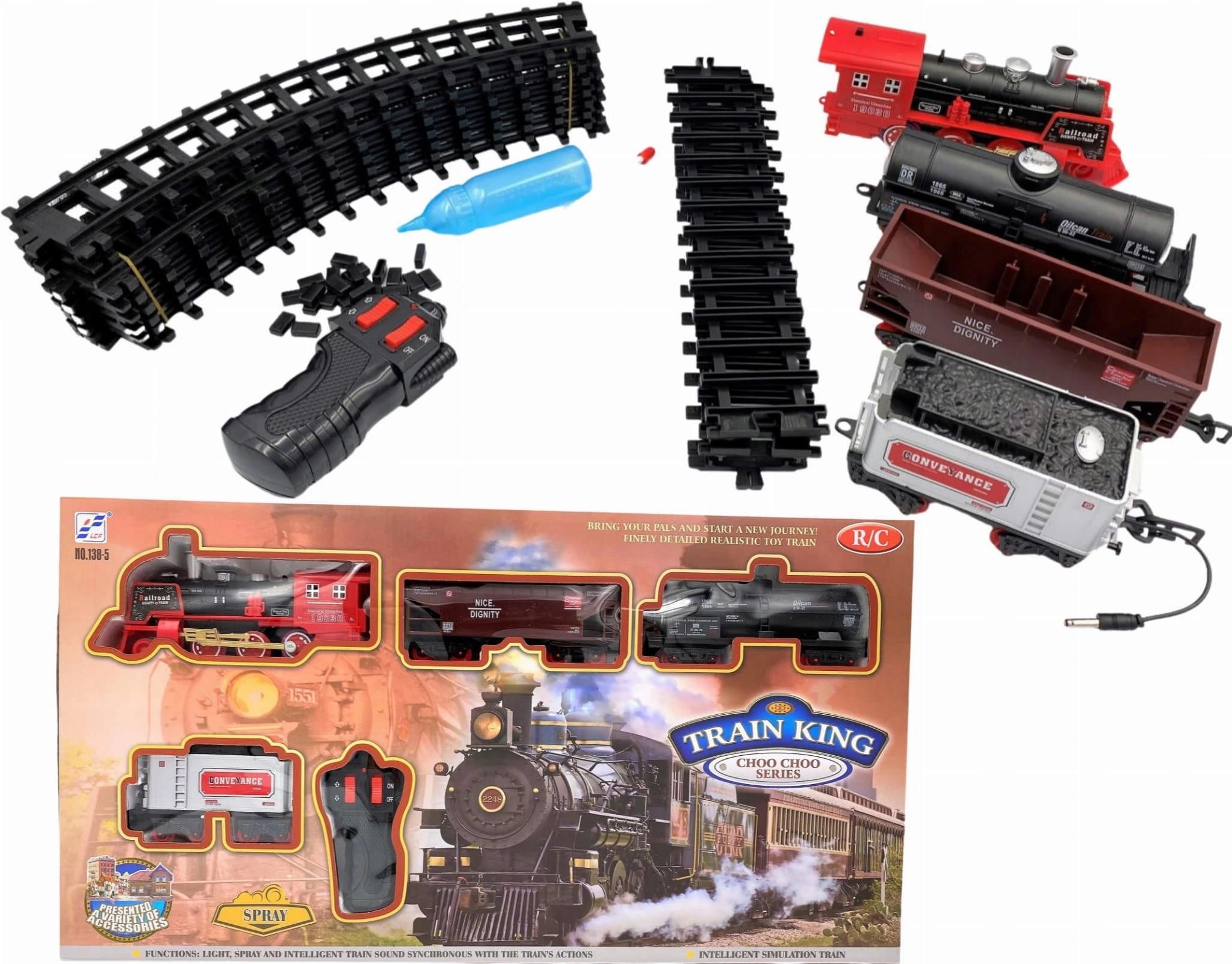 Elektryczna KOLEJKA Parowóz Zestaw POCIĄG + WAGONY Zabawa z zestawem kolejowym jest lubiana przez każdego z nas. Dla dzieciaków to świetny sposób na rozwinięcie swojej kreatywności, czy przestrzennego myślenia, natomiast dla rodziców to super okazja do spędzenia czasu z dziećmi. Z pewnością będą Ci towarzyszyć ogromne emocje przy składaniu tego zestawu. Poczuj się jak na prawdziwej stacji kolejowej, dzięki realistycznemu wykonaniu zabawki. Lokomotywa wydaje dźwięki, posiada efekty świetlne a co bardziej zaskakujące puszcza dym z komina. Produkt wysokiej jakości, starannie wykonany z dbałością o szczegóły. Zawartość zestawu: lokomotywa, wagony, tory, zaczepy torów, pilot elementy dekoracyjne. Wymiary opakowania: 55 x 30 x 7 cm Wiek: 3+