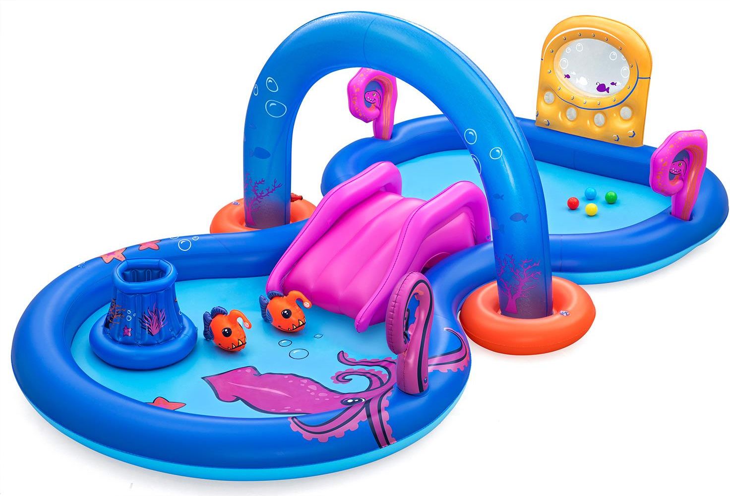 Dmuchany Plac Zabaw DLA DZIECI Podwodny Świat 330x 188x 177cm Bestway 53167 Dmuchany Plac Zabaw Podwodny Świat 330 x 188 x 177 cm Bestway 53167 Zamień swój ogród w tętniącą życiem rafę koralową, gdzie Twoje dzieci staną się odważnymi odkrywcami tajemnic głębin morskich! Wodne centrum zabaw Bestway Podwodny Świat to ogromna przestrzeń, która zapewni maluchom niezapomniane chwile pełne wodnej radości. Dzięki realistycznemu projektowi podwodnego świata, dzieci poczują się jak prawdziwi badacze morskich głębin, a ich oczy rozbłysną zachwytem. Centrum zabaw wykonane jest z wytrzymałego PVC, co gwarantuje odporność na intensywną zabawę. Zintegrowany zraszacz wodny w formie zdejmowanego łuku zapewnia orzeźwiające chłodzenie w upalne dni. Odłączana zjeżdżalnia wodna gwarantuje szybkie i ekscytujące zjazdy, a dodatkowe atrakcje, jak gra w sortowanie na ścianie łodzi podwodnej oraz wiele interaktywnych akcesoriów, zapewniają mnóstwo rozrywki! Dane techniczne wymiary 330 cm x 188 cm x 177 cm materiał PVC 4 piłki do zabawy 2 rybki pojemność 276 litrów sugerowany wiek 2+ zawór spustowy i zawory bezpieczeństwa odłączana zjeżdżalnia wodna łuk ze zraszaczem wodnym gra do sortowania
