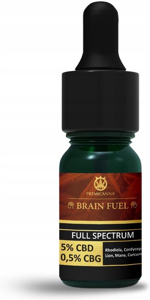 olejek konopny Premicanna Brain Fuel 5% (+nootropy) W każdej buteleczce mieści się: Ekstrakt z kwiatów konopi z zagranicznych upraw indoor o stężeniu CBD 10% Ekstrakt alkoholowy z konopi odmiany Santica z polskich upraw standaryzowany na zawartość 1% CBG Wyciąg z grzybów Lion’s mane (soplówka jeżowata) Wyciąg z grzybów Cordyceps Kurkumina Piperyna Ekstrakty standaryzowane są na zawartość CBD 10% oraz THC poniżej 0,2%. 200 kropel = 10 ml1 kropla zawiera: 5 mg CBD 0.5 mg CBG Informacje o składnikach:- LION'S MANE (Soplówka jeżowata) to grzyb od dawna znany w medycynie chińskiej posiada związki, które znacząco poprawiają pamięć, głównym związkiem jest tu Erinecyna A, która poprawi koordynację mózgu oraz funkcje poznawcze, chroni komórki nerwowe działając na czynnik wzrostu nerwów, niweluje stany lękowe i depresję. Odżywcze owocniki grzybów mają również właściwości przeciwbakteryjne, antynowotworowe, kardioprotekcyjne, hepatoprotekcyjne i nefroprotekcyjne. - Cordyceps to kolejny grzyb od wieków stosowany w medycynie dalekiego wschodu, znosi on skutki przewlekłego stresu i przewlekłego zmęczenia, podnosi poziom energii. Poza charakterystycznymi cechami adaptogenu Cordyceps uodparnia na stres i poprawia libido. Reguluje metabolizm oraz korzystnie wpływa na układ odpornościowy zwiększając produkcję limfocytów NK, które związane są z odpornością na nowotwory. -Rhodiola Rozea, inaczej Różeniec górski, jest to suplement, który oddziałuje na nas troszeczkę euforycznie, poprawia libido i motywację do działania. Przy jego suplementacji możemy odczuć wzrost poziomu energii, witalności na co dzień, wykazuje wzrost wytrzymałości u sportowców długodystansowych. -Kurkumina może pozytywnie wpływać na nasz mózg i zmniejszyć ryzyko występowania chorób mózgu. Spowalnia procesy starzenia. Kurkumina może pomagać w leczeniu depresji bo ma potencjał przeciwlękowy i przeciwdepresyjny. Wpływa pozytywnie na serotoninę i dopaminę. Ma właściwości przeciwzapalne. - Piperyna jest głównym aktywnym składnikiem pieprzu czarnego, a połączona w kompleksie z kurkuminą zwiększa biodostępność o 2000%. - CBD zawarte w ekstrakcie z konopi w znacznym stopniu obniża kortyzol, podwyższone poziomy kortyzolu skutkują szeregiem niepożądanych objawów takich jak przybranie na wadze wahania nastroju, lęk i bezsenność. Skutecznie podnosi sprawność układu odpornościowego. - CBG posiada właściwości przeciw psychotyczne, antydepresyjne, przeciw zapalne, wzmacnia działanie CBD oraz innych kannabinoidów znajdujących się w ekstrakcie z konopi. Dlaczego na naszych produktach nie ma podanej zalecanej wielkości porcji, dawkowania?Obecnie polskie prawo nie pozwala określać olejków CBD suplementami diety. Producenci znakujący w ten sposób swoje produkty narażają się na karę administracyjną ze strony Sanepidu.Zgodnie z powyższym, wskazanie zalecanej do spożycia dawki zarezerwowane jest dla suplementów diety i leków. Jak wskazaliśmy powyżej, olejek CBD nie posiada takiego statusu i w związku z tym, nie znajdziecie Państwo takich wskazań na naszych produktach.