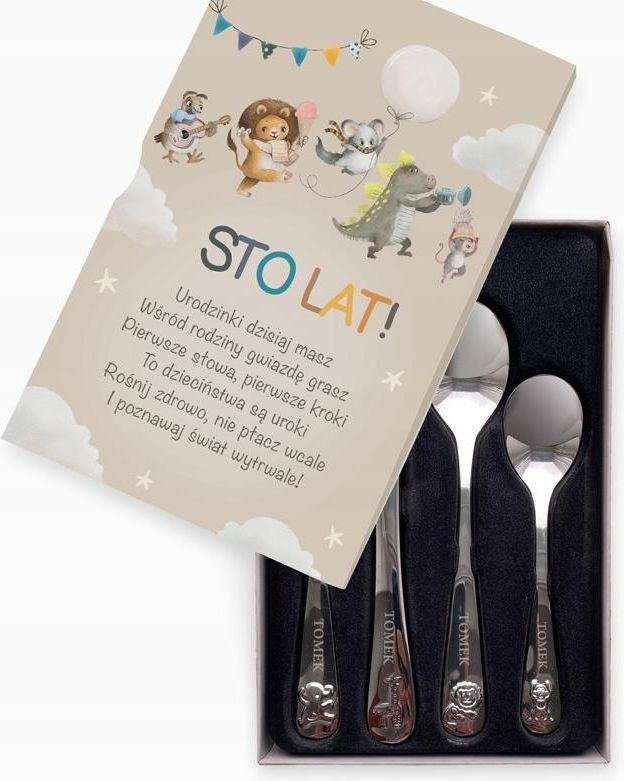 Sztućce dziecięce na prezent urodzinowy wraz z pudełkiem z życzeniami to nie tylko praktyczny podarunek, ale także doskonały sposób na wyróżnienie dziecka. Ten spersonalizowany i elegancki upominek na pewno ucieszy małego solenizanta. Niech te urocze sztućce z imieniem przynoszą wiele radości i uśmiechu podczas każdego posiłku. Dając dziecku zestaw sztućców w prezencie, oferujesz funkcjonalny podarunek, który będzie codziennie używany. Sztućce z imieniem stanowią także osobisty akcent, który sprawia, że prezent jest wyjątkowy. Sztućce dziecięce na prezent urodzinowy to zestaw składający się z czterech elementów: widelec, nóż, łyżka i łyżeczka. Każdy z nich wykonany jest z wysokiej jakości stali nierdzewnej i posiada wygrawerowane imię. Dodatkowo na każdym sztućcu znajduje się wypukłe zdobienie przedstawiające jedno z czterech różnych zwierzątek. Całość jest elegancko zapakowana w kolorowe pudełko z atrakcyjną grafiką i życzeniami urodzinowymi na wieczku. Uwaga! Podczas składania zamówienia prześlij imię dziecka do wygrawerowania na sztućcach. Zdecydowanie przyspieszy to realizację zamówienia! Wymiary: Pudełko: 13 cm x 19 cm x 3 cm.