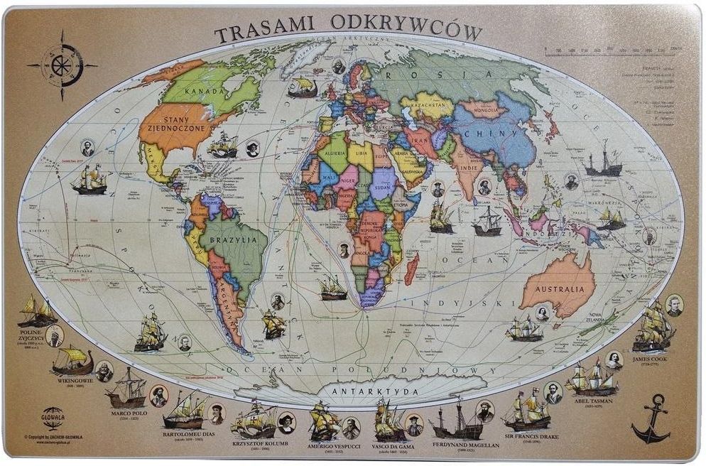 Aktualny podział polityczny + informacje o wyprawach i odkrywcach poszczególnych zakątków Ziemi. Antypoślizgowa.