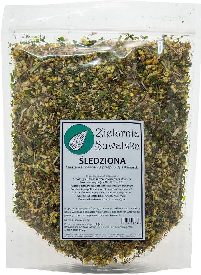 Śledziona 350 g wg Klimuszki – Ziołowa receptura wspierająca filtr krwi Śledziona 350 g wg Klimuszki to unikalna mieszanka stworzona na bazie receptury z kultowej książki „Wróćmy do ziół leczniczych” autorstwa o. Czesława Klimuszki – cenionego zielarza i mistyka. Zioła dobrano z myślą o naturalnym wsparciu funkcji śledziony – narządu odpowiedzialnego za filtrowanie krwi, odporność i równowagę metaboliczną. Co wyróżnia tę mieszankę? Tradycyjna receptura – zgodna z podejściem Klimuszki, bazującym na holistycznym spojrzeniu na zdrowie. Naturalne wsparcie śledziony i krwiobiegu – dzięki właściwościom oczyszczającym, przeciwzapalnym i regulującym. 7 ziół w równych proporcjach – dla zrównoważonego działania. Składniki i ich działanie Arcydzięgiel litwor – wspiera układ pokarmowy, działa rozgrzewająco i harmonizująco. Pokrzywa zwyczajna – działa oczyszczająco i mineralizująco. Kocanki piaskowe – wspomagają wątrobę i detoksykację. Rumianek pospolity – łagodzi stany zapalne i wspiera trawienie. Dziurawiec zwyczajny – działa wzmacniająco i poprawia nastrój. Glistnik jaskółcze ziele – znany ze wsparcia pracy wątroby i dróg żółciowych. Koper włoski (fenkuł) – poprawia trawienie, działa rozkurczowo. Jak stosować? Ojciec Klimuszko zalecał długotrwałe stosowanie, z tygodniowymi lub dwutygodniowymi przerwami między miesiącami kuracji. Zioła najlepiej parzyć długo (nawet 3 godziny), przecedzić i pić ciepłe. Dla kogo? Dla osób z podejrzeniem lub problemami śledziony Dla wspierających oczyszczanie krwi i poprawę trawienia Dla zainteresowanych naturalnymi metodami ojca Klimuszki Dla miłośników fitoterapii i tradycyjnego ziołolecznictwa Dodatkowe informacje Żadnych informacji na stronie nie można traktować jako zaleceń medycznych! Data minimalnej trwałości jest jednocześnie numerem partii i jest zawarta na etykiecie produktu – w celu potwierdzenia daty przydatności prosimy o kontakt. Zasady przechowywania: przechowywać w suchym miejscu. Wyprodukowano w Polsce dla: Zielarnia Suwalska Agnieszka Żukowska, ul. Kościuszki 112C/U2, 16-400 Suwałki