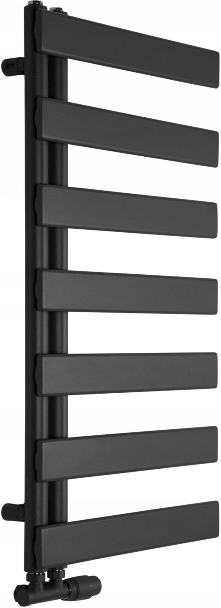 Grzejnik łazienkowy Uncommon 900x500mm 360W czarny Nowoczesny grzejnik łazienkowy o zbudowany z prostokątnych listew. Asymetryczne usytuowanie pionowych kolektorów grzejnika nadaje mu dekoracyjnego charakteru, a jednocześnie pozwala na łatwiejsze przewieszanie ręczników. Grzejnik w kolorze czarnym idealny do małej łazienki. Informacje o grzejniku Moc 75/65/20 [W]: 360 Moc 55/45/20 [W]: 194 Moc 90/70/20 [W]: 449 Wysokość [mm]: 900 Szerokość [mm]: 500 Głębokość [mm]: 63 Rodzaj podłączenia: dolne D50 lewe, dolne D50 prawe Rozstaw podłączenia [mm]: 50 Kolor: czarny mat Pojemność wodna [l]: 3.6 Ciśnienie robocze [bar]: 4 Współczynnik n: 1.2109 Waga [kg]: 8.7 Zawartość opakowania Grzejnik, korek, odpowietrznik, uchwyty do montażu na ścianie. Zawory i dodatkowe akcesoria widoczne na niektórych zdjęciach nie są sprzedawane wraz z grzejnikiem i należy je dokupić oddzielnie.