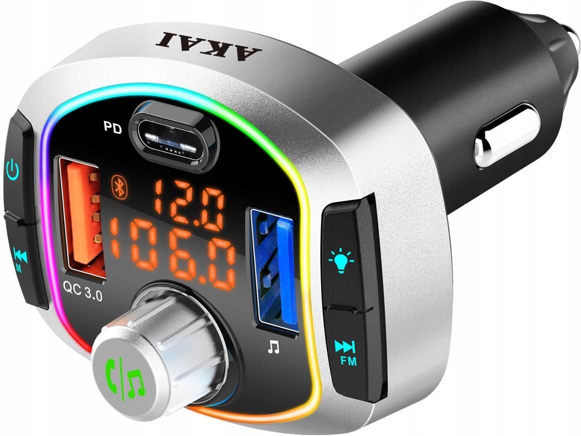 AKAI - WIODĄCY PRODUCENT SPRZĘTU ELEKTRONIKI UŻYTKOWEJ NA RYNKU JAPOŃSKIM i SINGAPURSKIM TRANSMITER SAMOCHODOWY Quick charger 3.0 BLUETOOTH FM AKAI FMT-63BT SPECYFIKACJA: Wersja Bluetooth - 5.0 Moc emisji kanału Blutooth - 2dbm Radio FM - 87,5-108 MHz Funkcja głośnomówiąca - tak Gniazda USB - odtwarzanie/ładowanie Karta SD/TF/MMC/Micro-SD-TF Obsługiwane formaty audio - WMA, MP3, WAV, FLAC Pasmo przenoszenia - 20 Hz-20 KHz Stosunek sygnał/szum - >60dB USB1: U-disk+ 5V/1A USB2: Quick charger 3.0 (3,6 V-12 V) Zasilanie AC/DC - DC 12V-24V/2,0A Wyświetlacz - LED z matrycą cyfrową Materiał obudowy - ABS+PC