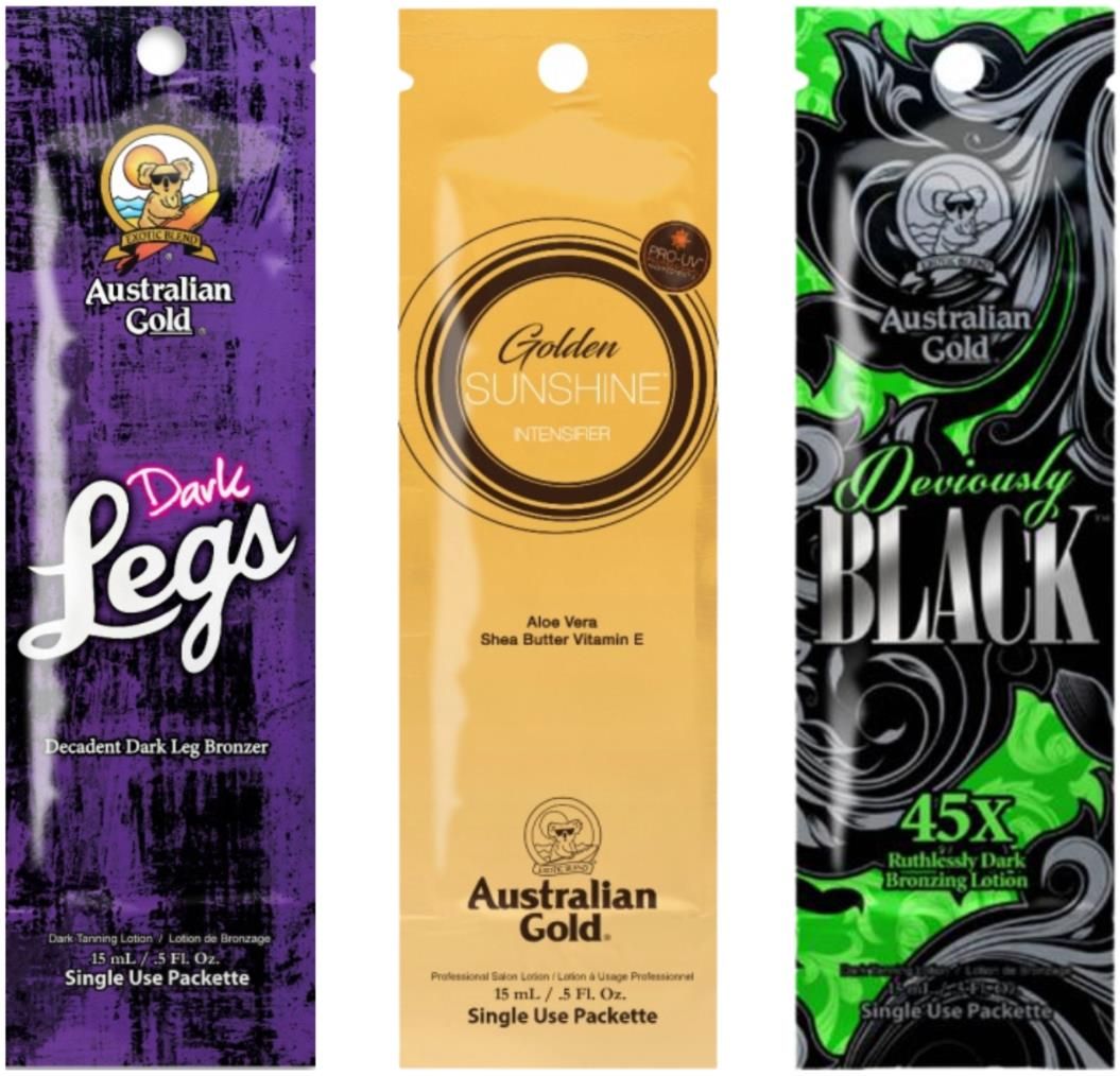 Australian Gold Zestaw Saszetek Do Opalania Australian Gold Deviously Black Najmocniejszy X45Australian Gold Deviously Black to kolejny prawdziwy „BRONZING POWER”! 45-krotna formuła brązująca zapewnia niesłychanie szybką i piękną opaleniznę. Oczywiście w połączeniu z pielęgnacją skóry typową dla produktów Australian Gold. Twisted Skincare Cocktail (zawierający m.in. witaminy, odżywcze olejki i ekstrakty z absyntu) oczyszcza, regeneruje i pielęgnuje skórę.Australian Gold Dark Legs Do Opalania NógDark Legs™ to produkt stworzony specjalnie z myślą o trudno opalających się nogach.Dzięki naturalnej formule „LEGit Bronzers” uzyskasz w ekspresowym tempie przepięknie opalone nogi.Nowy „Silky Softness Complex” sprawi, że Twoje nogi będą gładkie i miękkie w dotyku, a kompozycja „Perfection Blend”ujędrni skórę.Dark Legs™ zawiera substancje brązujące o natychmiastowym i o opóźnionym działaniu, aby zapewnić ciemną, równą opaleniznę, która utrzyma się wyjątkowo długo.Australian Gold Natural Golden Sunshine Do OpalaniaFantastyczny dark tanning accelerator, pozwalający szybko uzyskać ciemną, naturalnie wyglądającą, seksowną opaleniznę.Ten balsam jest wzbogacony m.in. o aloes (odżywia i pielęgnuje skórę), aminokwasy (regenerują skórę po opalaniu), masło shea (sprawia, że skóra jest miękka w dotyku), witaminy A i E (wygładzają drobne linie i zmarszczki) i wyciąg z bananów, który utrzymuje skórę młodą i jędrną.