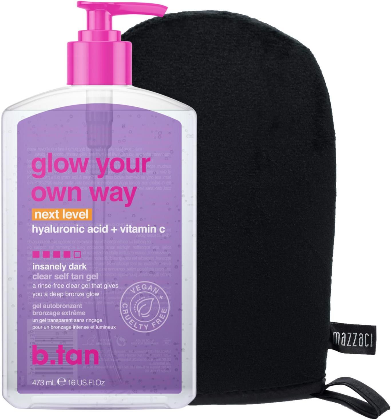 b.tan Glow Your Own Way Next Level + Rękawicab.tan Glow Your Own Way Next Level Przezroczysty Żel Samoopalający 473mlLubisz, kiedy twoja opalenizna jest prawdziwie ciemna, a skóra pełna blasku? Poznaj nowy wymiar opalania z naszym przezroczystym, niebrudzącym żelem samoopalającym, który pomoże ci stworzyć szalenie ciemną opaleniznę, którą możesz rozwinąć w biegu — bez zdejmowania ubrań. Oszczędź sobie stresu i zafunduj sobie opaleniznę na jeszcze wyższym poziomie, pozwalając kwasowi hialuronowemu i witaminie c dodać twojej skórze blasku, który przyciągnie wszystkie spojrzenia.Czym jestem?Jestem niebrudzącym żelem samoopalającym, dzięki któremu zabłyśniesz od razu po aplikacji! Nie musisz mnie nawet zmywać. Do tego zawieram kwas hialuronowy + witaminę c, które odżywiają twoją skórę, jednocześnie pogłębiając jej kolor.Dlaczego mnie pokochaszJestem niebrudzącym żelem samoopalającym, z którym będziesz gotowa do działania od razu po aplikacji... Nie musisz już czekać na prysznic!Zawieram kwas hialuronowy + witaminę c, które nadadzą ci ekstra blaskuStworzę na twoim ciele szalenie ciemną opaleniznę, a do tego nawilże wygładzę twoją skóręJestem 100% wegański, bez paskudnych dodatków, takich jak parabeny. W dodatku kocham zwierzęta, więc jestem w 100% cruelty free.Mazzaci Rękawica Do Nakładania SamoopalaczaAplikator do kremu samoopalającegoRękawica wykonana jest z miękkiego materiału aplikacyjnego, który zapewnia dokładną i pozbawioną smug, idealnie równą aplikacje.Super miękka aksamitna, delikatna w dotyku, zapewnia łatwą i przyjemną aplikacje.Współpracuje ze wszystkimi formułami, dając piękny efekt, bez smug.Ulepszona bariera chroniąca przed przeciekaniem, zapobiegająca plamieniu rąk.Kolor wyróżnia się na półce i świetnie komponuje się pozostałymi opakowaniami produktów Mazzaci