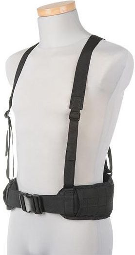 Lekkie, regulowane pasoszelki w układzie "X" z pasem biodrowym. Przystosowane są do przenoszenia oporządzenia. Pas posiada regulację obwodu od 820 do 1280 mm co pozwala na optymalne dopasowanie oporządzenia do budowy użytkownika. Obszyty został palsami zgodnymi ze standardem MOLLE. Dane techniczne Materiał: Nylon Waga: 325 g Kolor: Czarny Długość pasa: 820 - 1280 m